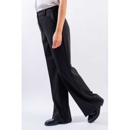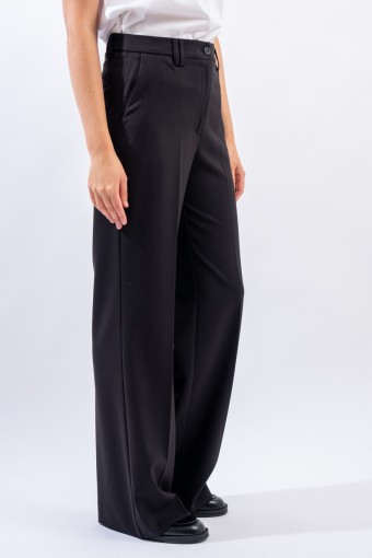 Pantalone stretch dal taglio formale a palazzo. Presenta la piega stirata, tasche oblique sul davanti e a filetto sul retro. Chiusura con zip e bottone, passanti in vita per la cintura. Un classico intramontabile che non può mancare nel guardaroba di ogni donna!