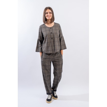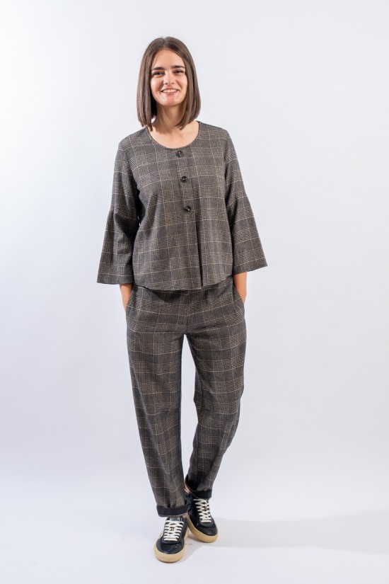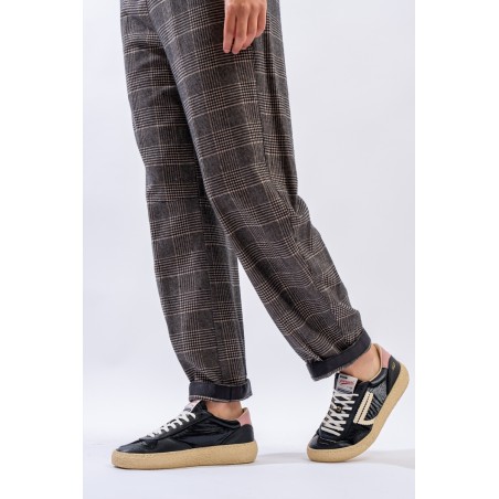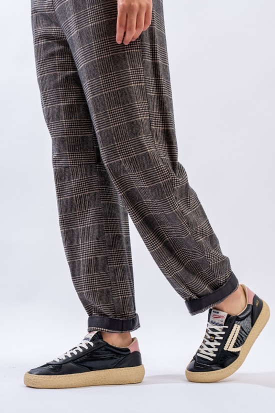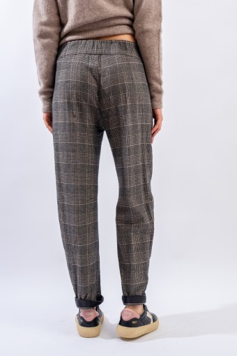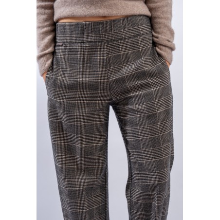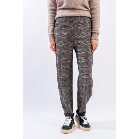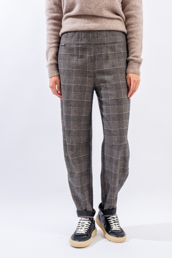 Pantalone comfort con vita elasticizzata realizzato in morbida flanella di misto cotone con motivo check all over. Presenta tasche alla francese e risvolto al fondo. Vestibilità rilassata per un'eleganza metropolitana che combina comfort e stile.