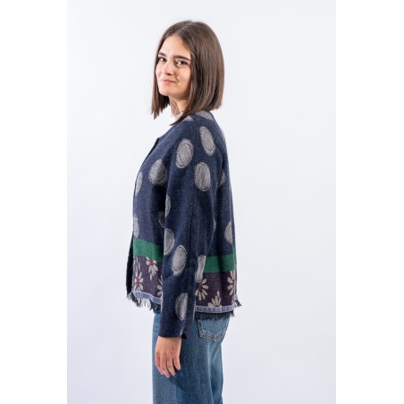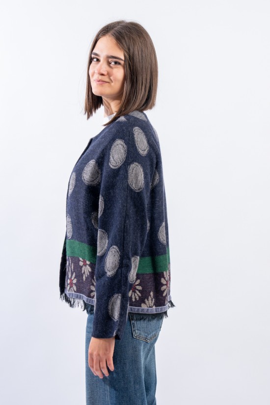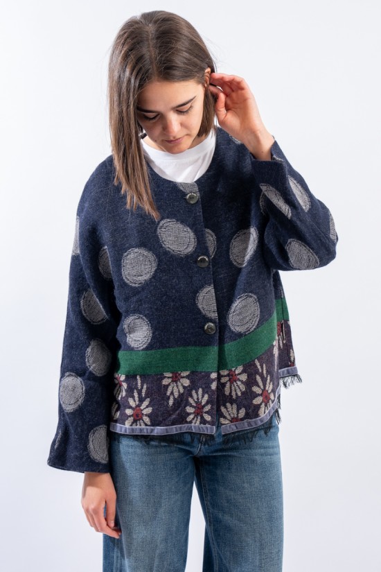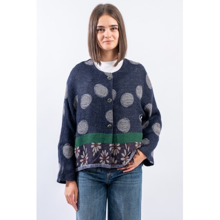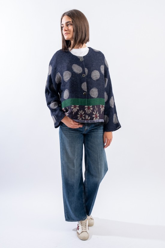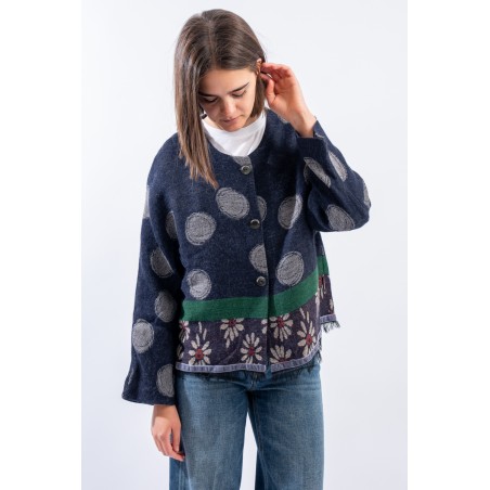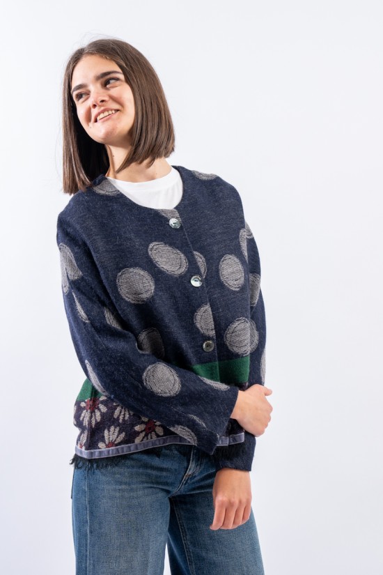 Giacca in maglia realizzata in misto lana e alpaca con motivo jacquard in cui si alternano le fantasia dei pois e delle margherite, iconici di Alessia Santi. Presenta girocolo e chiusura con bottoni logati. Inserto in velluto e orlo sfrangiato. Made in Italy.
