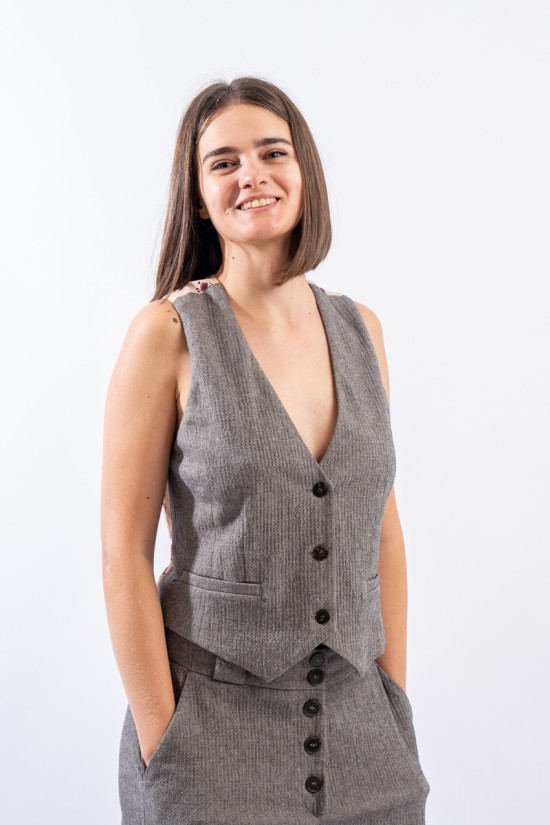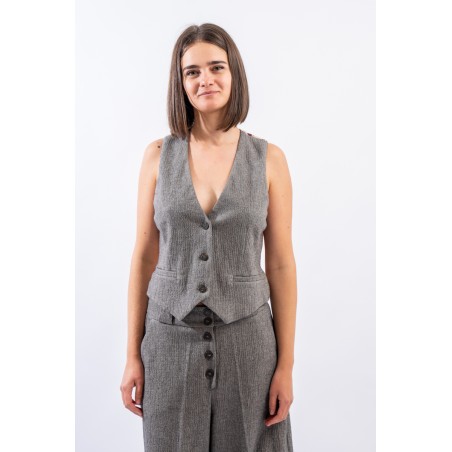 Gilet dal design sartoriale realizzato in tweed di misto cotone stretch. Presenta scollo a V, tasche a filetto e chiusura con bottoni. Impreziosito sul retro dall'inserto in viscosa con delicata fantasia floreale. Femminile e sofisticato, perfetto da coordinare al suo pantalone nella stessa texture.