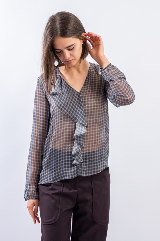 Raffinata blusa realizzata in un leggero mix di viscosa e seta con fantasia all over. Presenta delicato scollo a V con rouge, maniche con bottoncino sui polsi e taglio leggermente più corto sul davanti. Made in Italy.