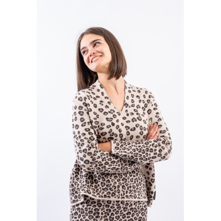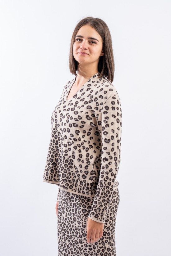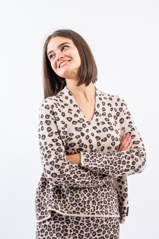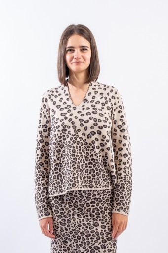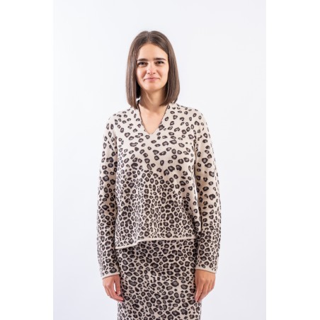 Maglia scollo a V in fantasia animalier con delicato tocco di lurex. Femminile e raffinato, realizzato in un piacevole mix di cotone e viscosa. Made in Italy.