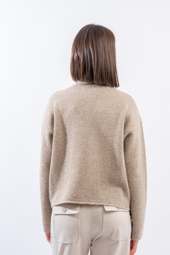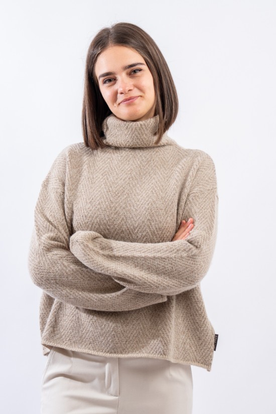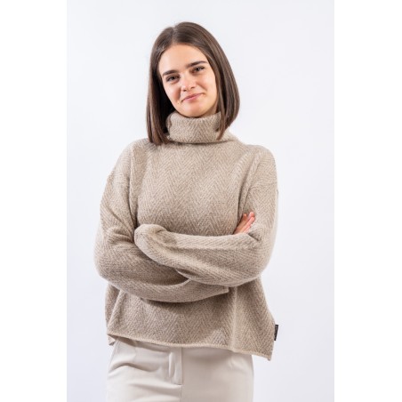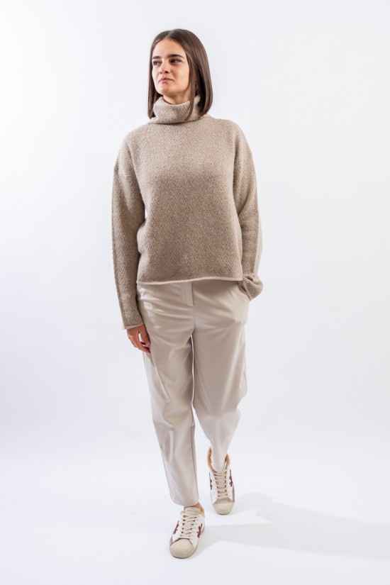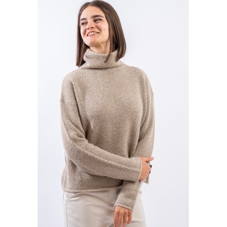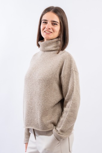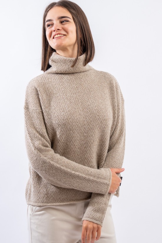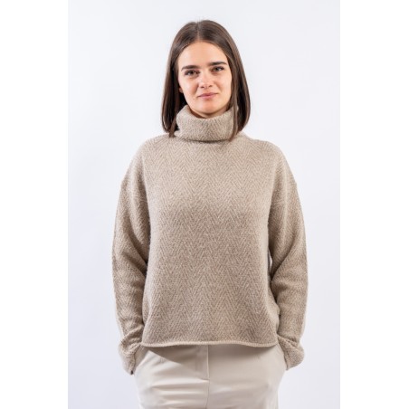 Maglia dolcevita dal taglio boxy realizzata in un morbido filato di misto viscosa e alpaca. Il motivo spinato in lurex impreziosisce il capo e dona un ricercata luminosità. Manica lunga e spalla scesa, vestibilità regolare. Made in Italy.