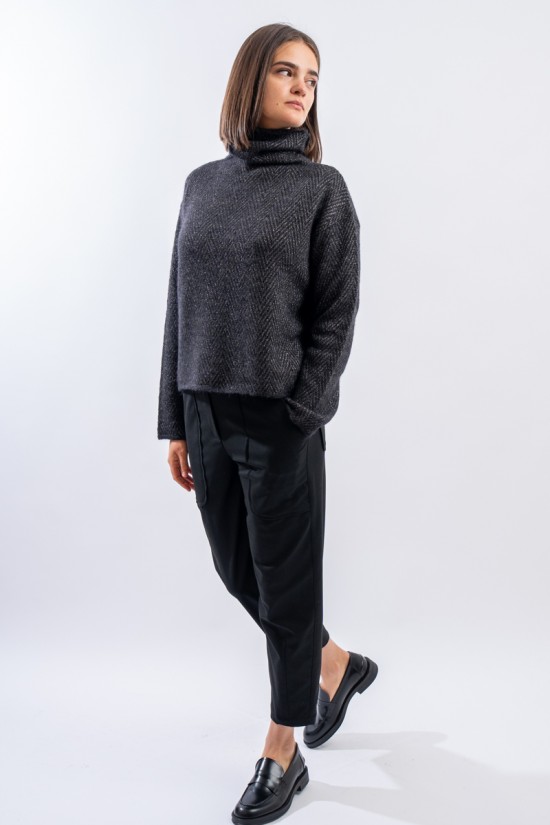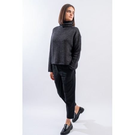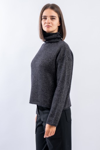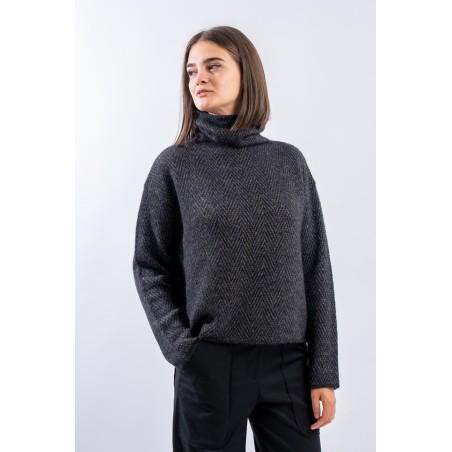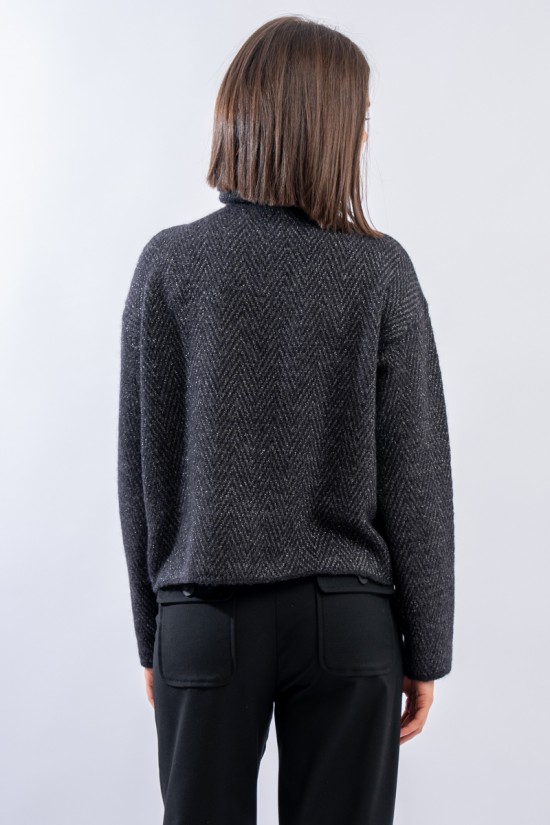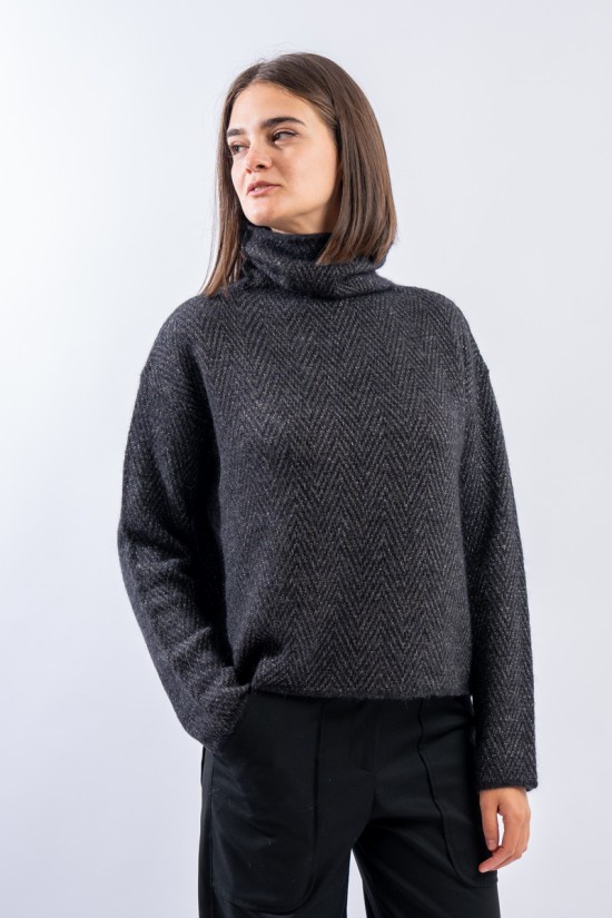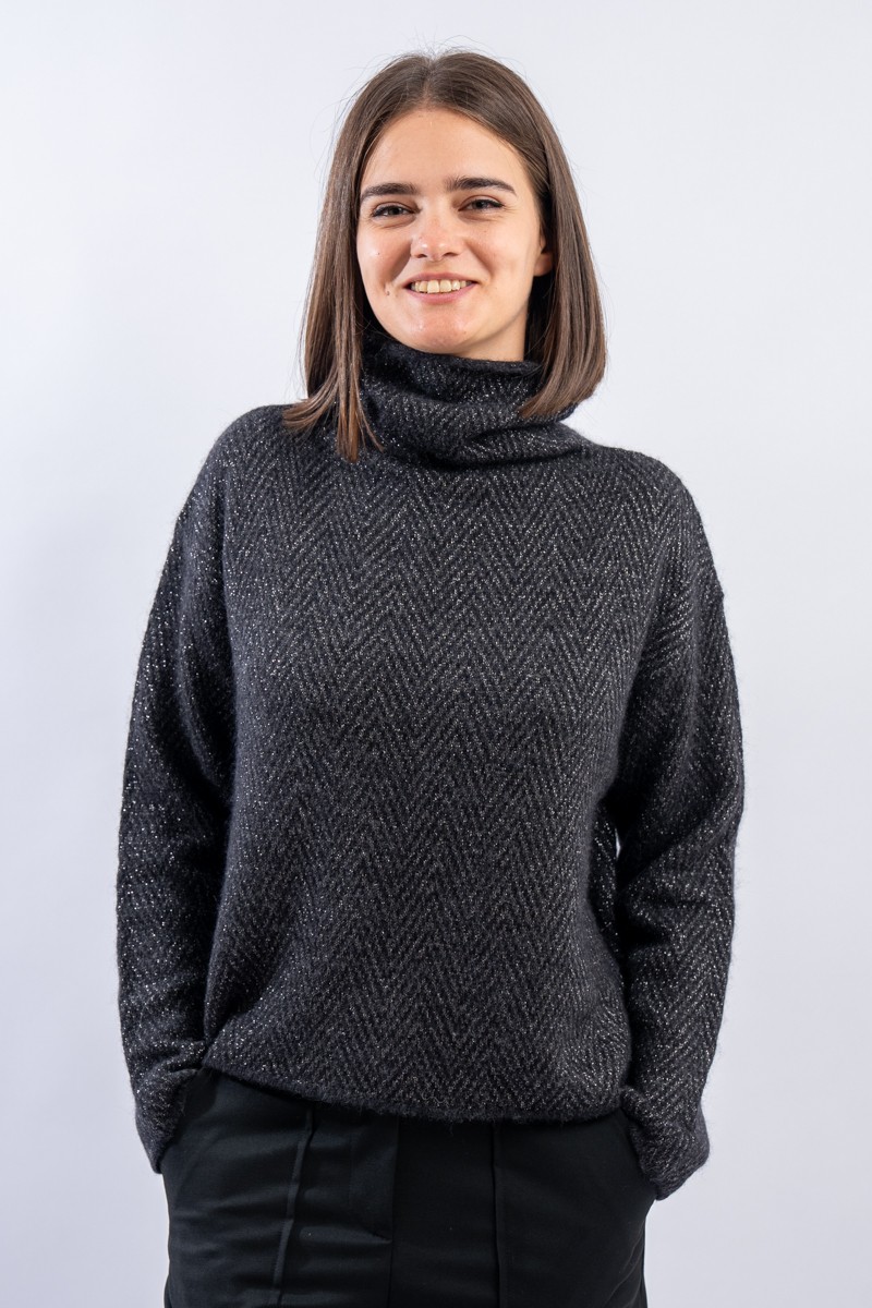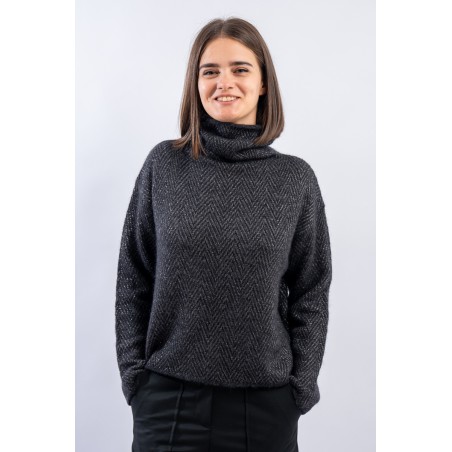 Maglia dolcevita dal taglio boxy realizzata in un morbido filato di misto viscosa e alpaca. Il motivo spinato in lurex impreziosisce il capo e dona un ricercata luminosità. Manica lunga e spalla scesa, vestibilità regolare. Made in Italy.