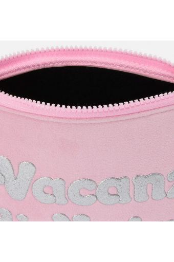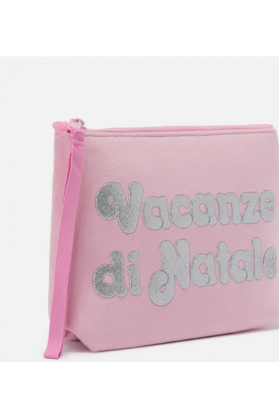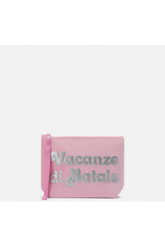 Pochette Aline appartenente alla linea Vacanze di Natale firmata Saint Barth. Luminosa divertente. Realizzata in morbido tessuto scuba effetto velluto ed impreziosita dall'iconica scritta "VACANZE DI NATALE" glitterata. Chiusura con zip e passante per polso in gros-grain. Ideale per celebrare le feste di Natale con lo stile firmato Saint Barth.