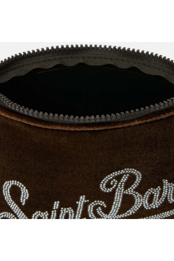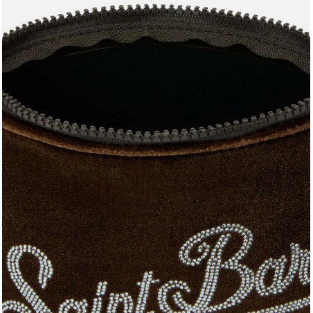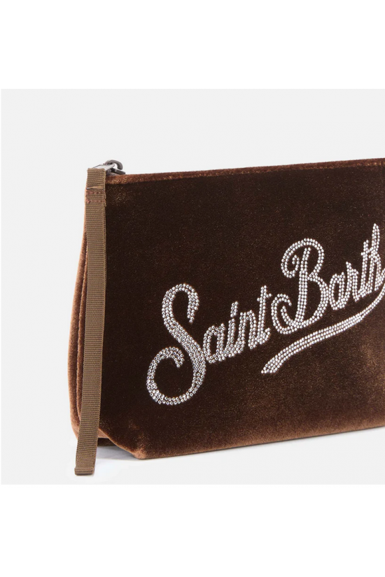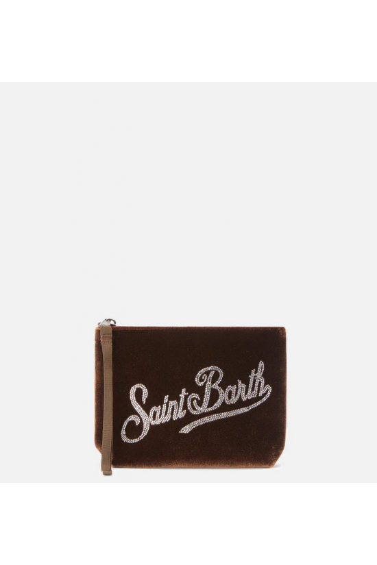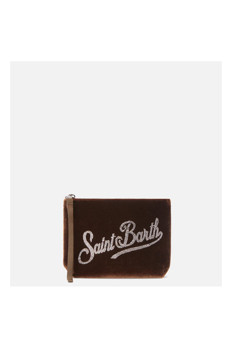 Pochette Aline di Saint Barth realizzata in morbido tessuto scuba effetto ciniglia impreziosita dalla scritta in strass "Saint Barth". Chiusura con zip e passante per polso in gros-grain. Brillante e raffinata dal look caldo e sofisticato.