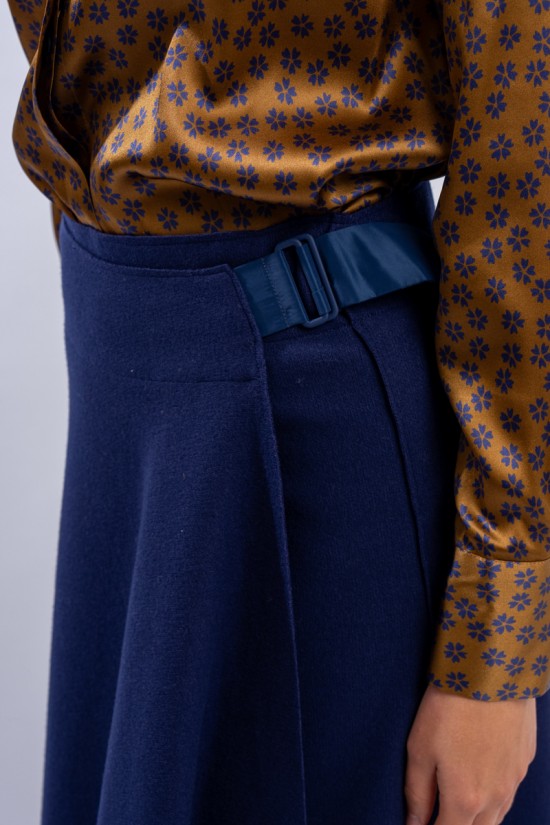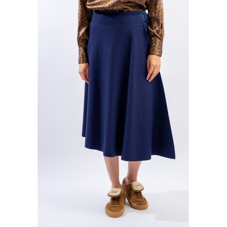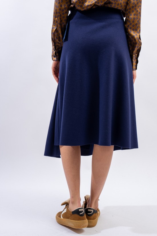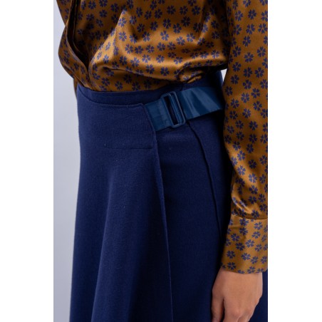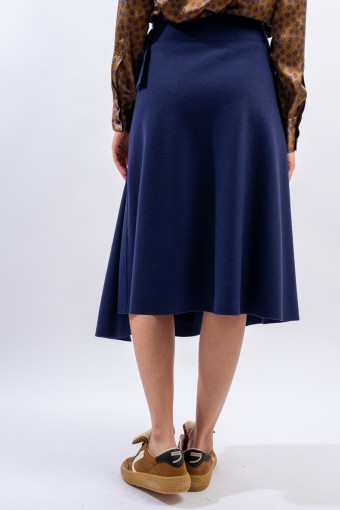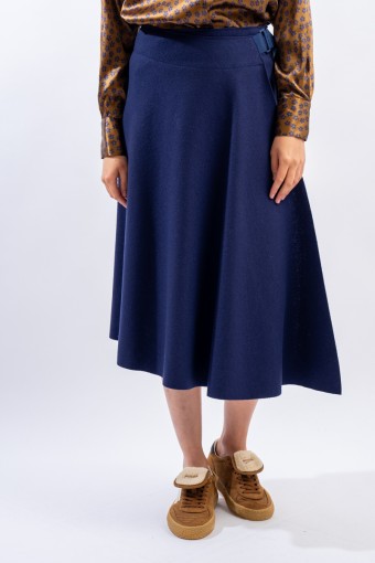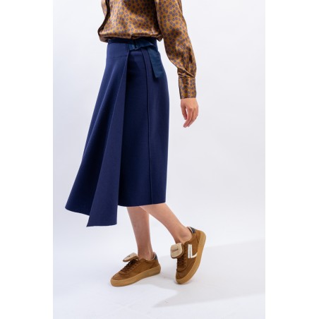 Gonna a portafoglio realizzata in un morbido panno di lana. Lunghezza sotto al ginocchio e taglio asimmetrico stondato sul fondo. Presenta chiusura con nastro in taffetà e bottoncino interno.