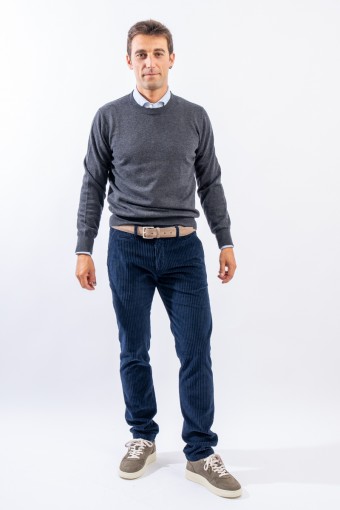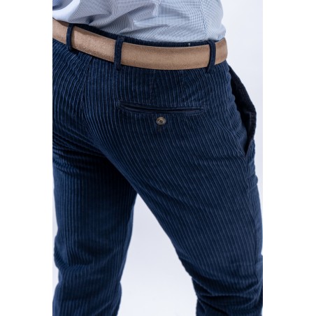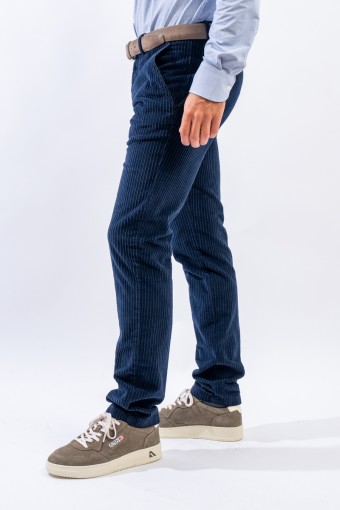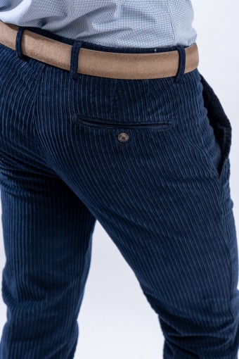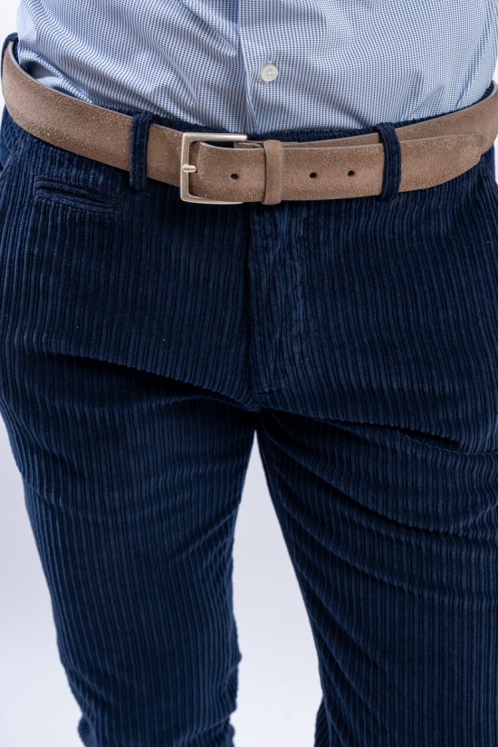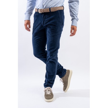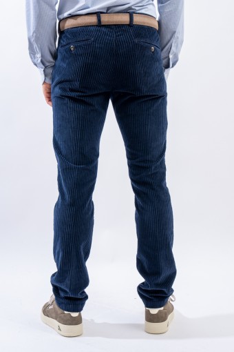 Pantalone a coste larghe effetto velluto. Realizzato in morbido cotone elasticizzato. Taglio classico completo di tasche a filo con bottone sul retro e due tasche laterali aperte. Made in Italy.