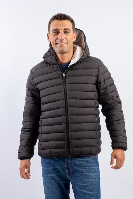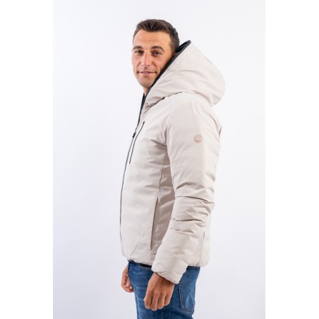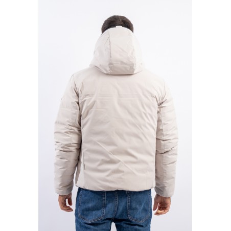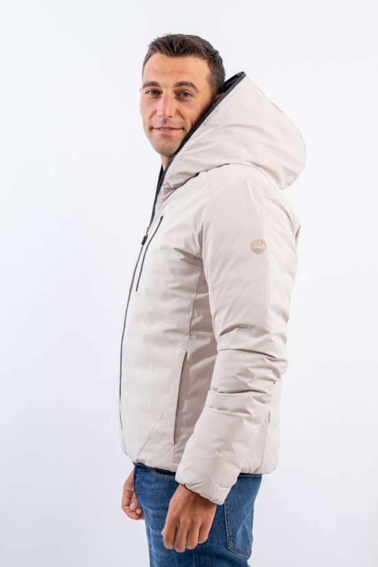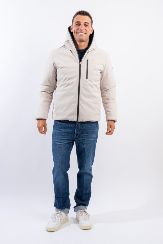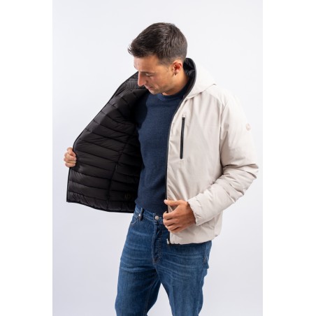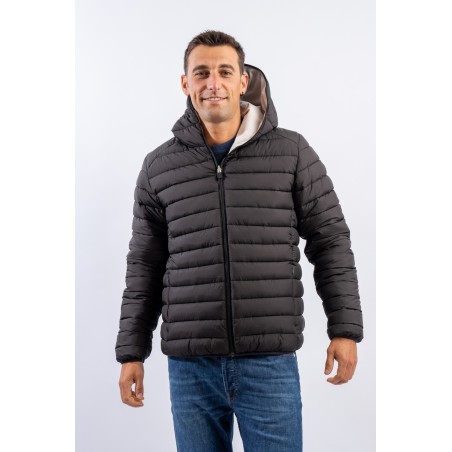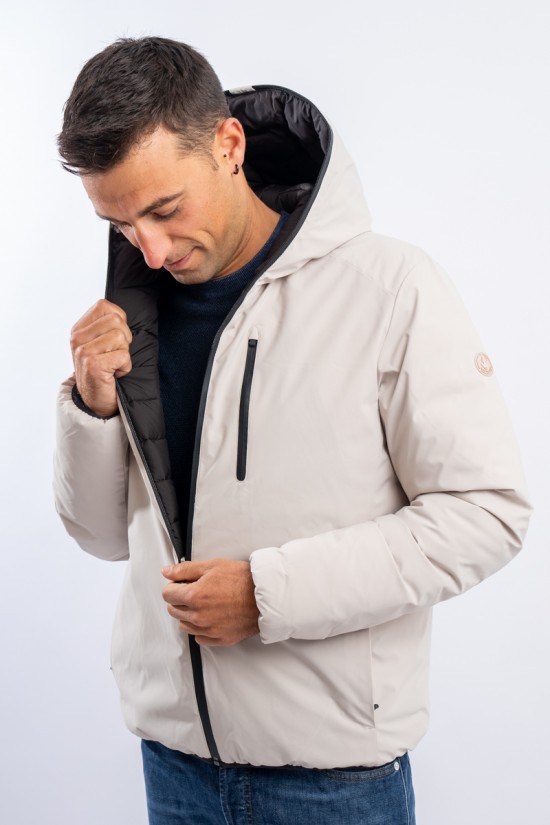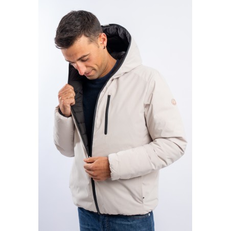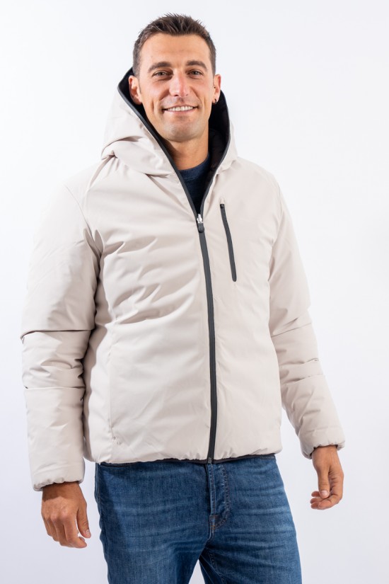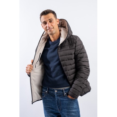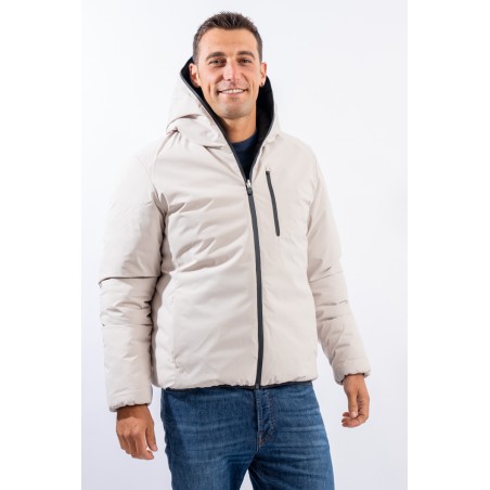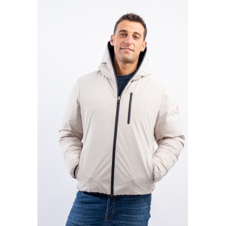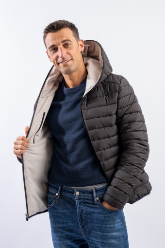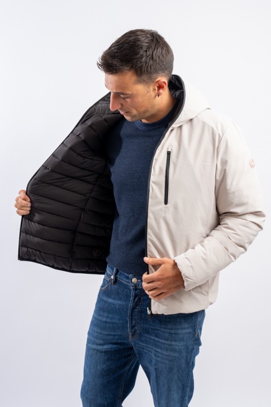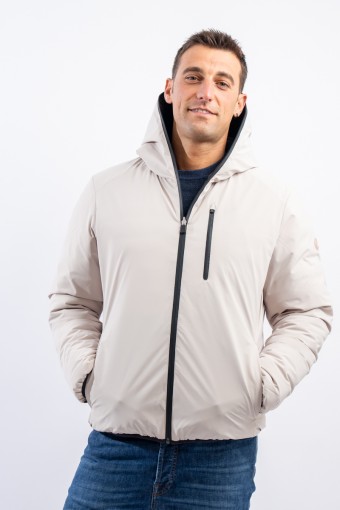 Giubbotto animal free, reversibile e compatto. Due look in uno. Da un lato un tessuto liscio ed opaco asseconda la linea pulita del capo, arricchita dalla full zip centrale e dal taschino ricavato sul petto. L'altro lato, un look più sportivo è caratterizzato da un classico boudine orizzontale rivestito da nylon opaco. Entrambi i lati presentano le due comode tasche laterali chiudibili con zip.