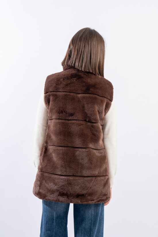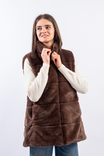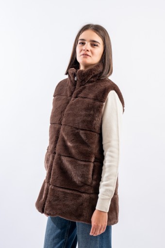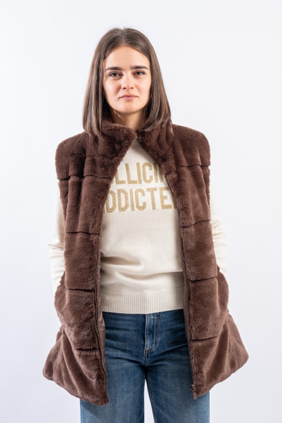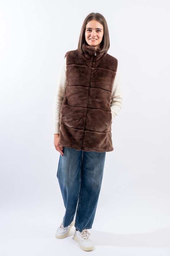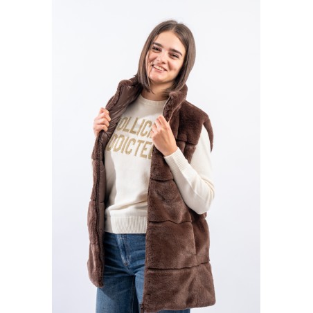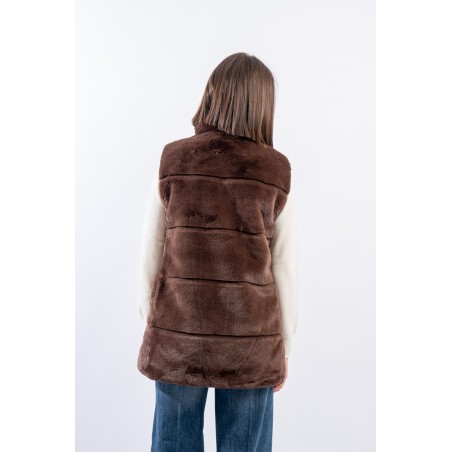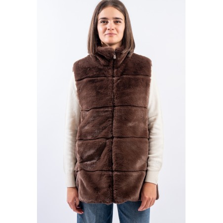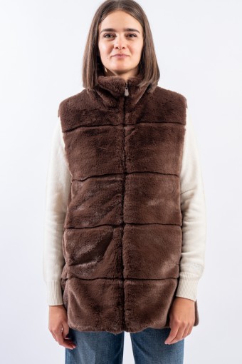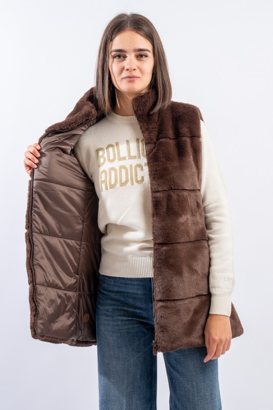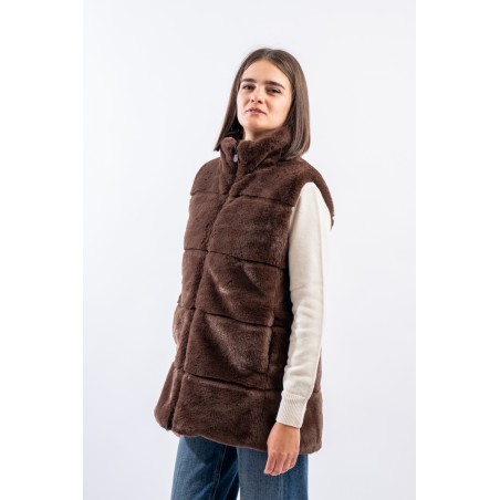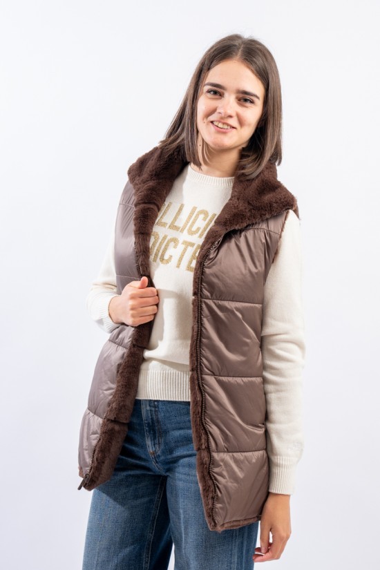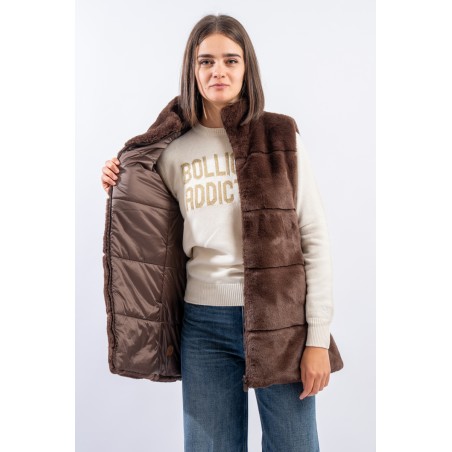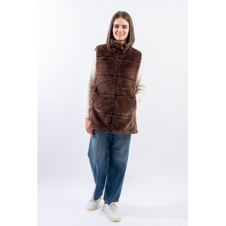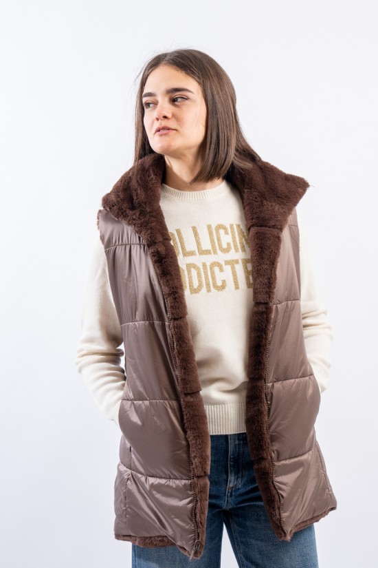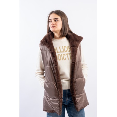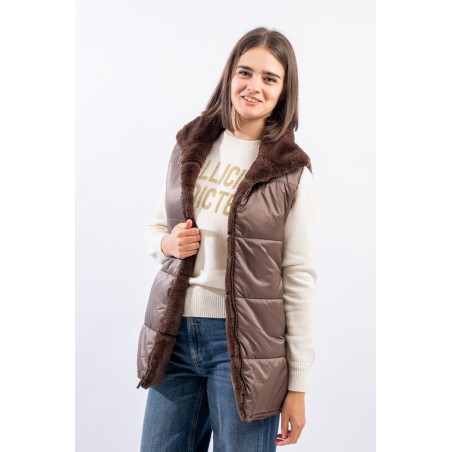 Gilet reversibile di media lunghezza con avvolgente collo in piedi. Realizzato in morbida ecopellicia effetto teddy da un lato e nylon cangiante con trapuntatura a budin dall'altro. L'imbottitura in plumtech, piuma sintetica riciclata, è un'ottima alternativa al vero piumino e assicura un perfetto isolamento termico. Tasche laterali aperte e chiusura con zip centrale.