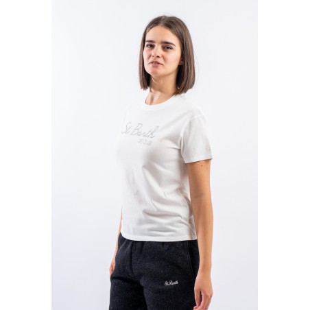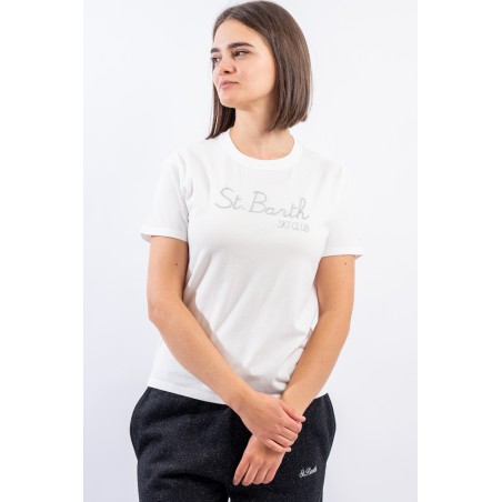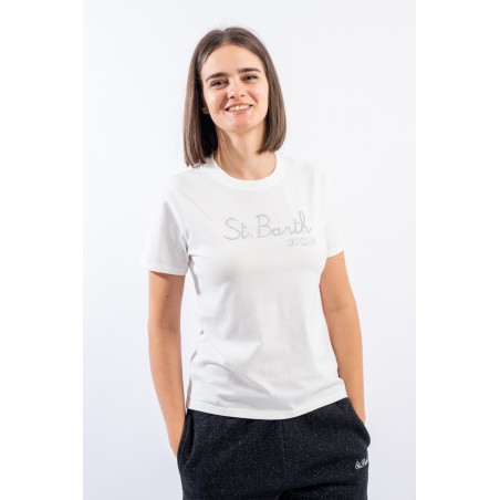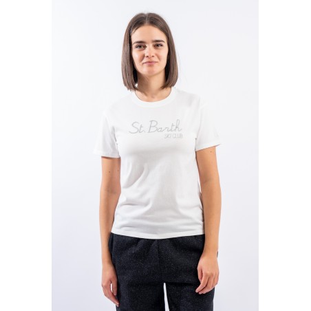 T-shirt girocollo a manica corta con scritta embossed "St. Barth ski club" in lurex. Vestibilità slim fit.