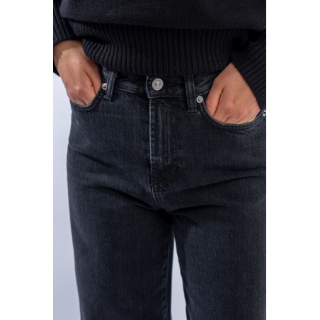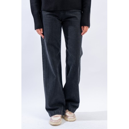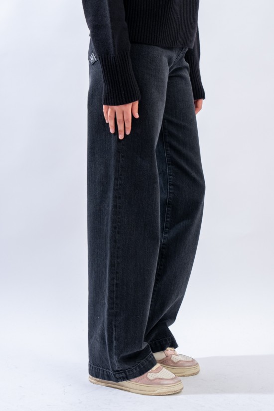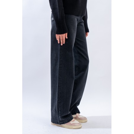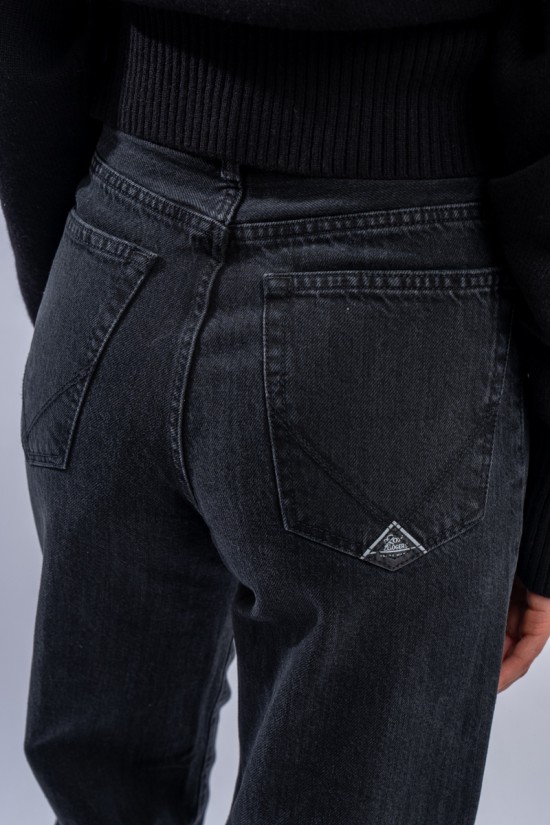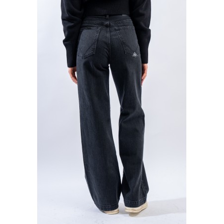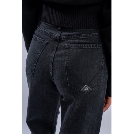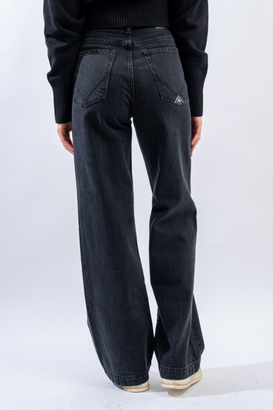 Marta è un modello iconico e amatissimo di Roy Roger's. Presenta vita medio/alta e gamba a palazzo. Realizzato in denim black con cuciture tono su tono e label in pelle sulla tasca posteriore. Made in Italy.