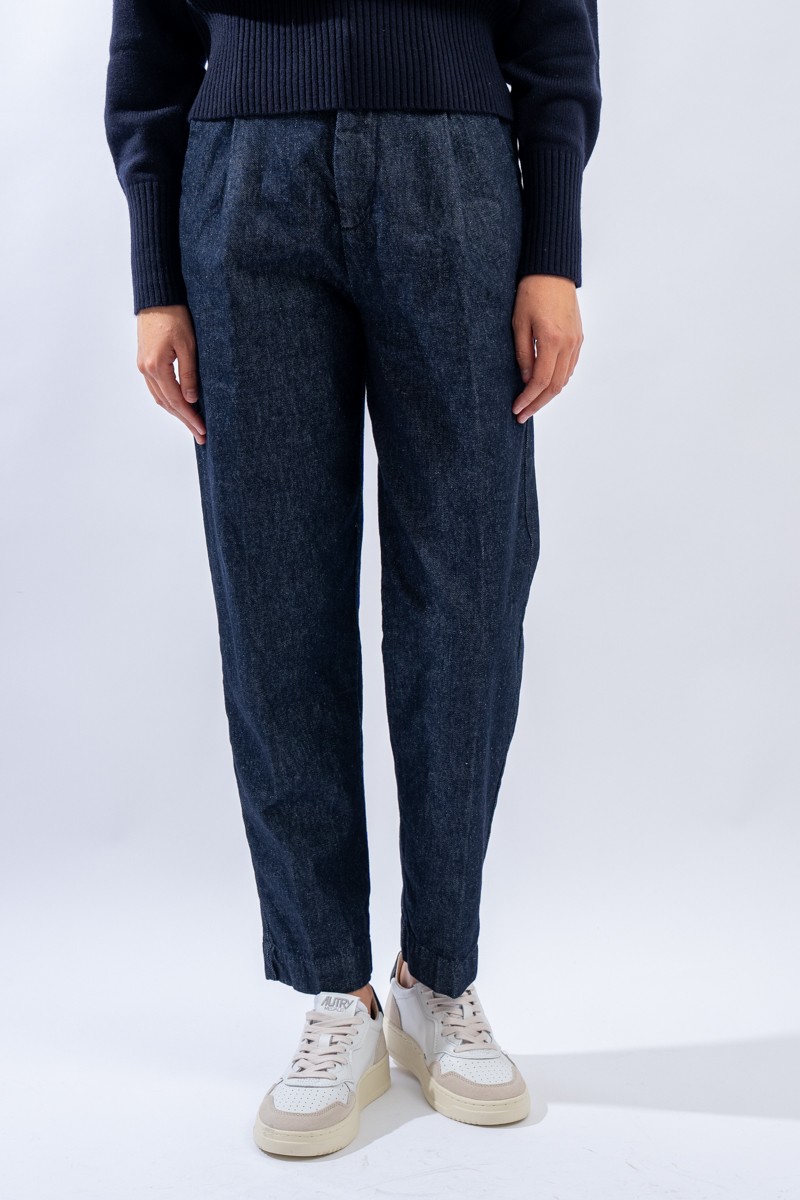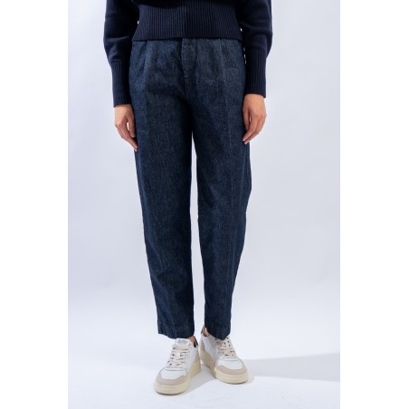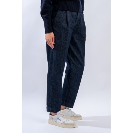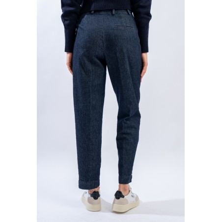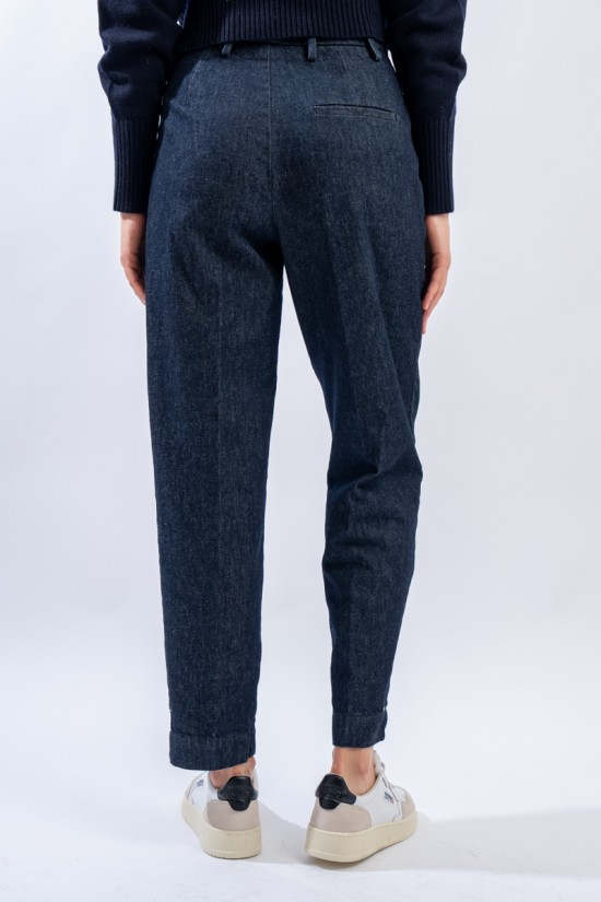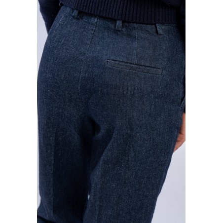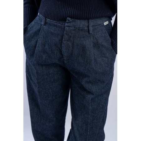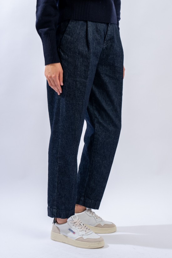 Pantalone taglio chino con pinces realizzato in blue denim. Tasche oblique davanti e tasche a filetto sul retro. Vita medio/alta e gamba morbida. Un mix perfetto: il taglio del pantalone e la praticità del jeans!