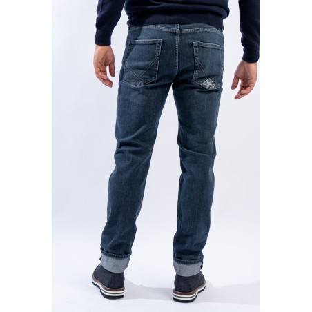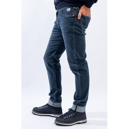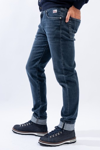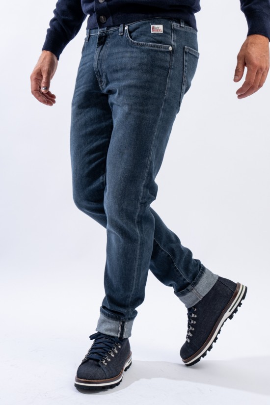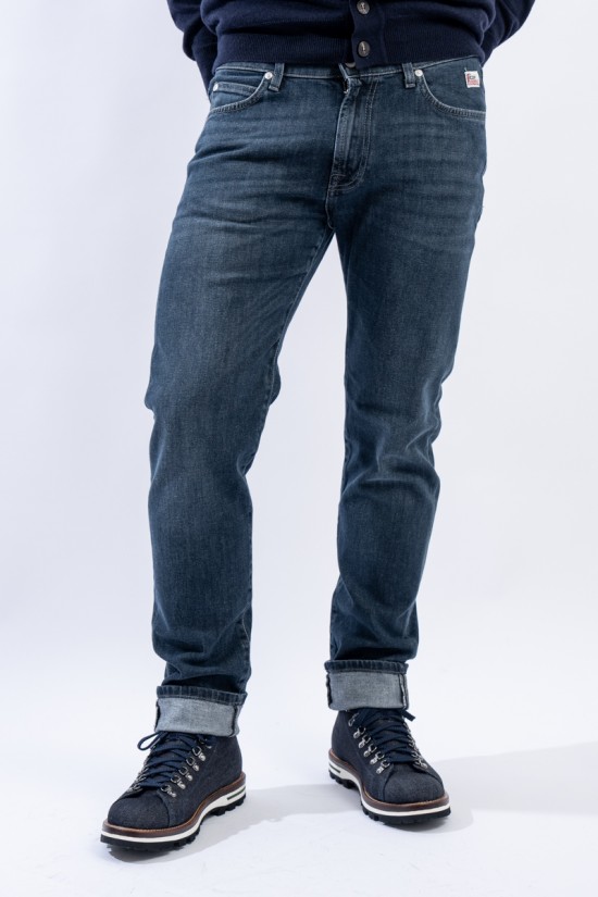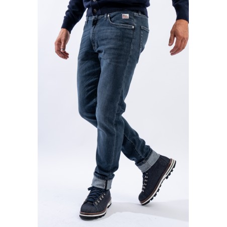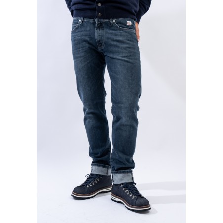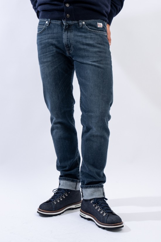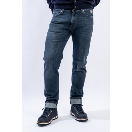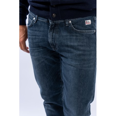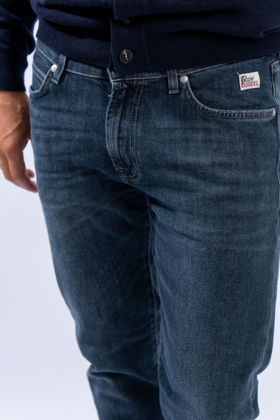 Jeans Roy Roger's 517 realizzati in denim, con lavaggio scuro e leggero effetto used. Slim fit dalla vita media. Chiusura con zip e bottone logato. Il 5 tasche, comodo e versatile. Immancabile il label Roy Roger's applicato sulla tasca dietro. Made in Italy.