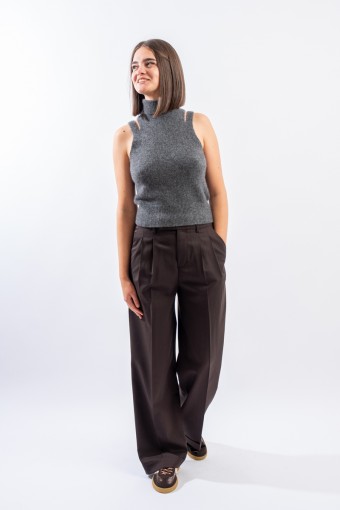 Pantalone dal gusto formale reso fresco e contemporaneo dal taglio aggiornato e dalle doppie pinces. Realizzato in lana color cioccolato è in perfetta sintonia con la tendenza dell'inverno. Presenta gamba ampia a palazzo e risvolto sul fondo. Chiusura con zip e bottoni, passanti per la cintura. Tasche oblique sul davanti e tasche a filetto sul retro. Fatto con cura in Italia.