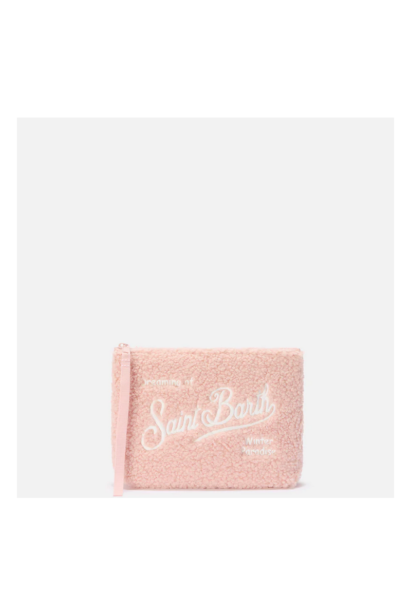 Pochette Aline di Saint Barth realizzata in morbido tessuto effetto shearling impreziosita dalla scritta ricamata a contrasto "Dreaming of Saint Barth Winter Paradise". Chiusura con zip e passante per polso in gros-grain. Raffinata pochette dal look caldo e confortevole.