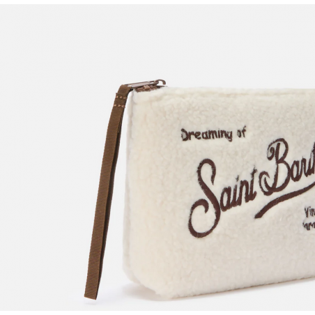 Pochette Aline di Saint Barth realizzata in morbido tessuto effetto shearling impreziosita dalla scritta ricamata a contrasto "Dreaming of Saint Barth Winter Paradise". Chiusura con zip e passante per polso in gros-grain. Raffinata pochette dal look caldo e confortevole.