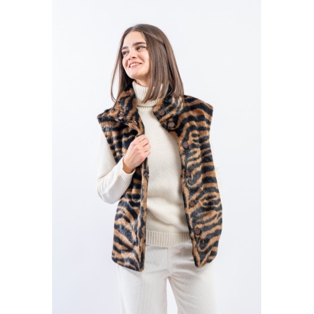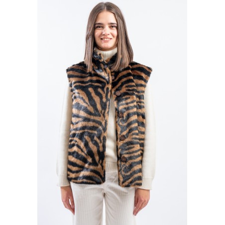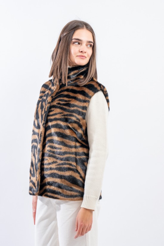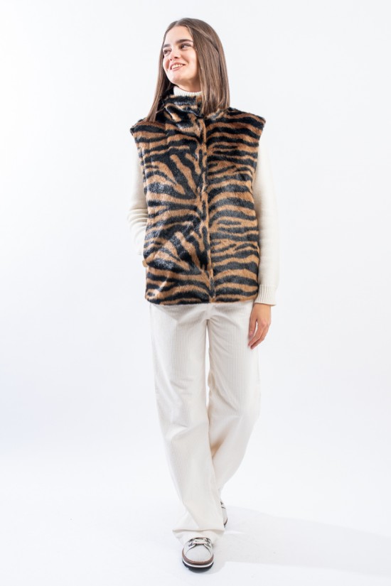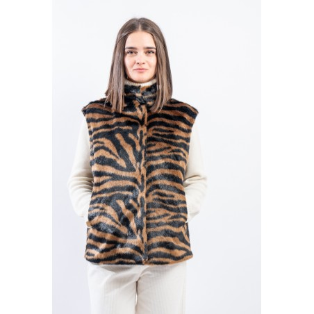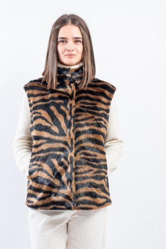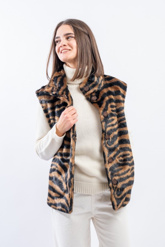 Gilet in ecopelliccia con stampa zebrata. Un capo scenografico e femminile, capace di stupire anche su un semplice outfit total black. Presenta collo in piedi e fondo dritto. Perfetto da indossare per il layering su maglioni o su un piumino sottile. il capo giusto per non passare inosservata!