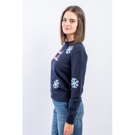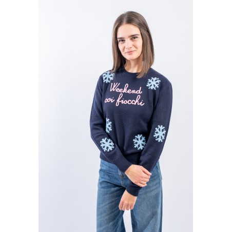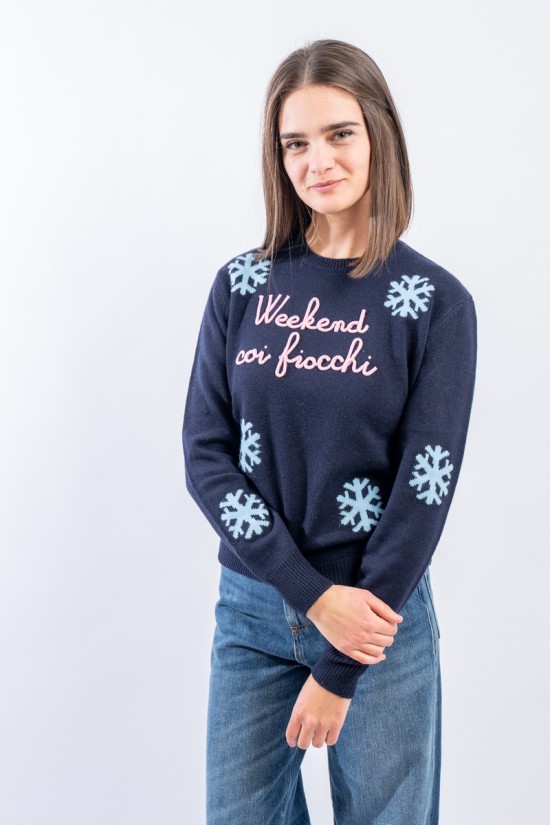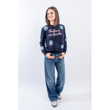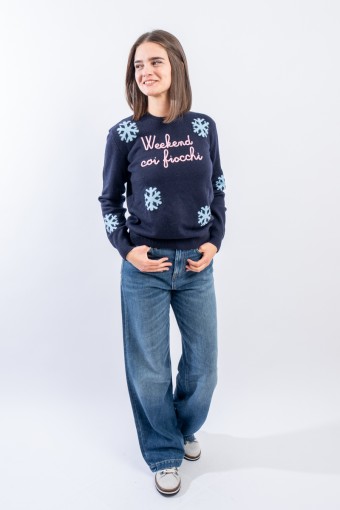 Maglia girocollo della linea Après ski impreziosita dalla grafica jaquard e dalla scitta embossed "Weekend coi fiocchi". Vestibilità slim fit. Ironica e colorata, perfetta per il tempo libero in città o per il weekend in montagna!