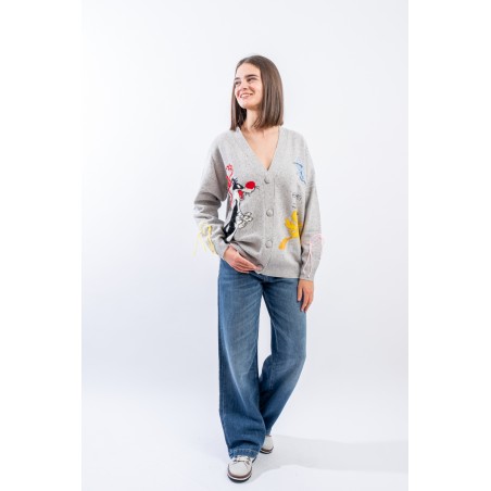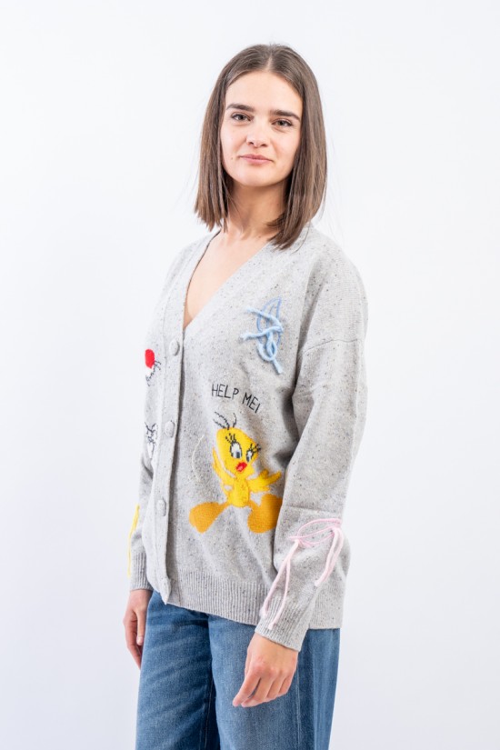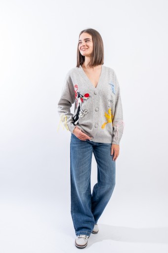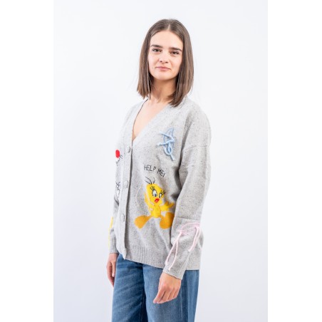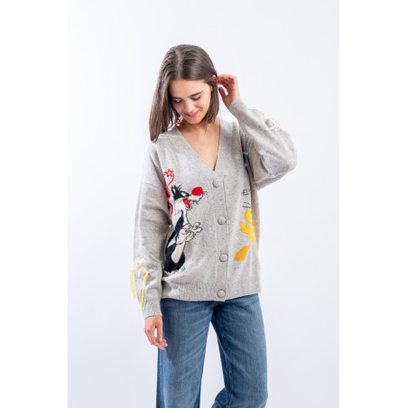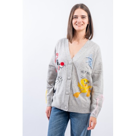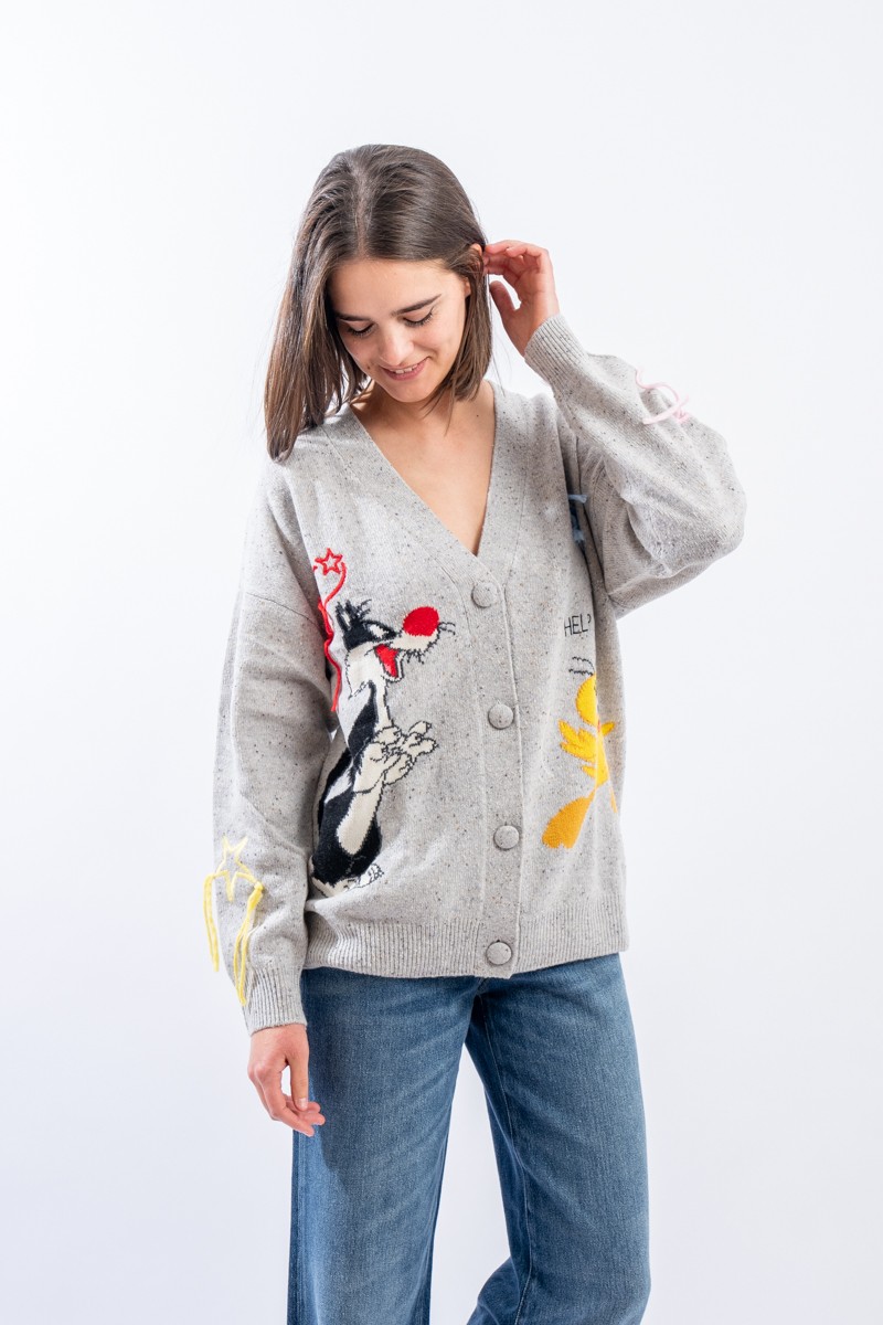 Maxi cardigan oversize con scollo a V e chiusura con bottoni. Caratterizzato dalla grafica "Gatto Silvestro e Titti". Casual e divertente, ideale per chi non vuole prendersi troppo sul serio!