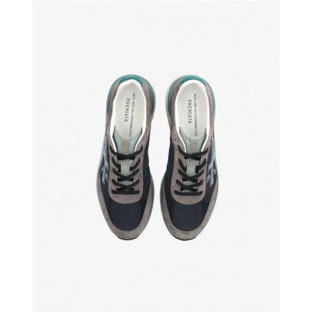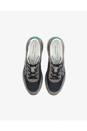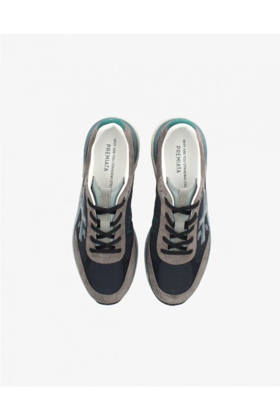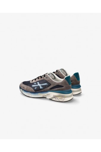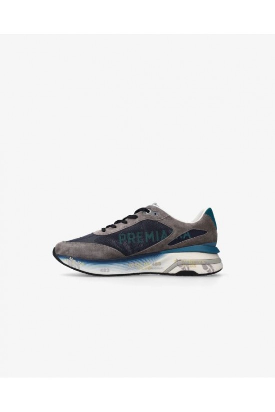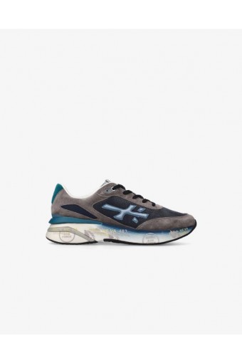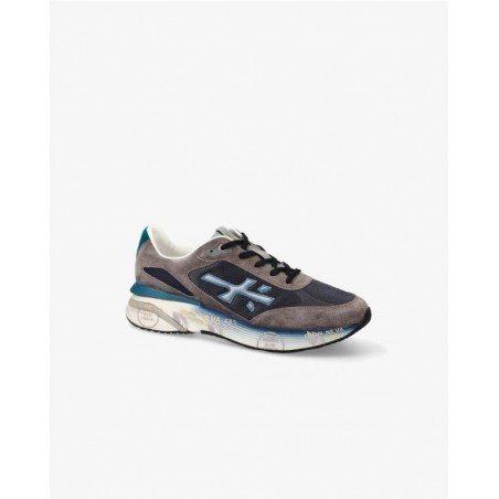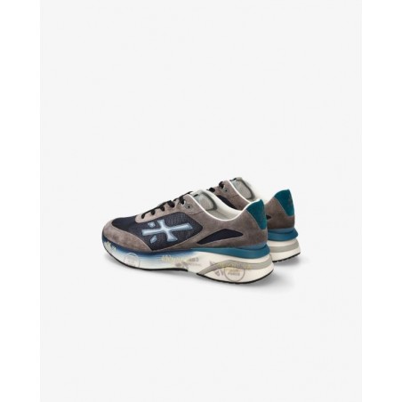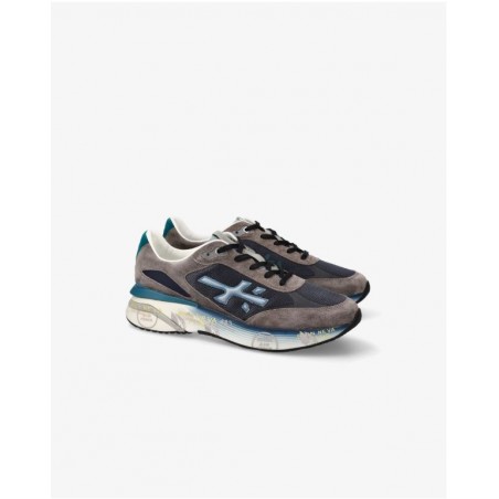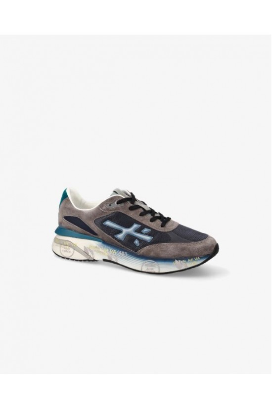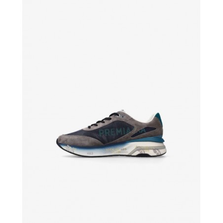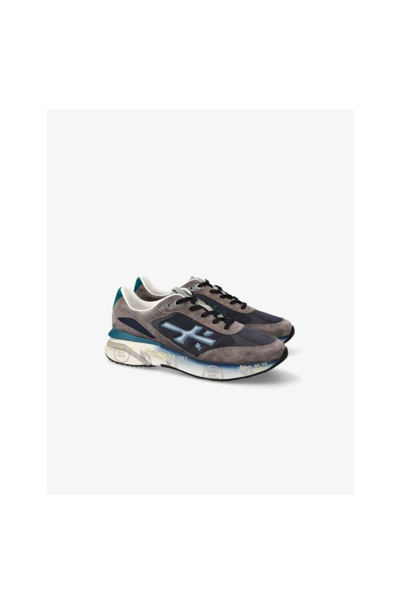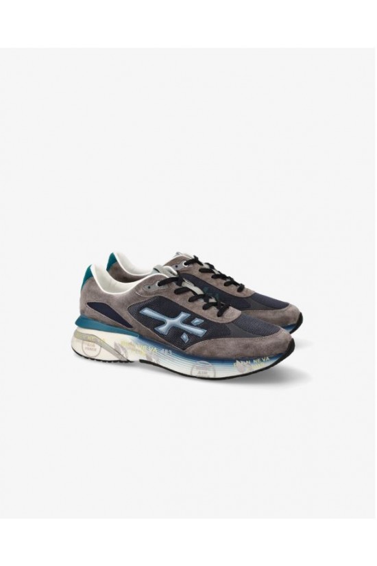Innovazione e leggerezza sono le caratteristiche che distinguono la nuova sneakers Moerun 7772 in casa Premiata. La tomaia è realizzata in pelle scamosciata e tessuto tecnico intrecciato sui toni del grigio e blu. Ricca di dettagli, dove sul lato esterno troviamo l'iconico macro logo applicato a contrasto di colore, mentre sul lato interno troviamo la stampa PREMIATA. La linguetta in pelle è arricchita con nome del modello inciso. Impreziosita dall'innovazione del fondo che rende la scarpa ammortizzata e dalla suola che riporta il lettering iconico di Premiata.