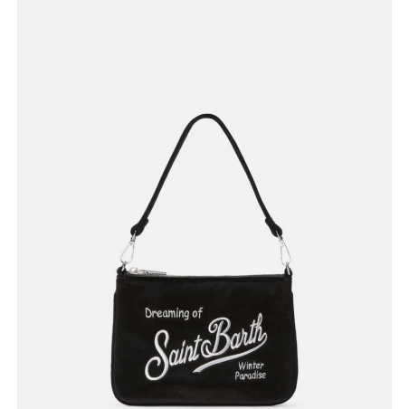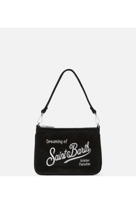 La Parisenne mini velvet Pochette è realizzata in morbido tessuto effetto ciniglia, impreziosita dalla scritta ricamata a contrasto "Dreaming of Saint Barth Winter Paradise" in filato di brillante. Borsetta a spalla con chiusura a zip metallica. Raffinata, morbida e chic è il perfetto accessorio per portare l'essenziale sempre con te.