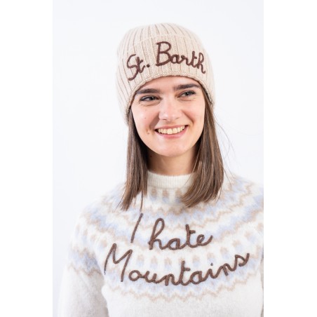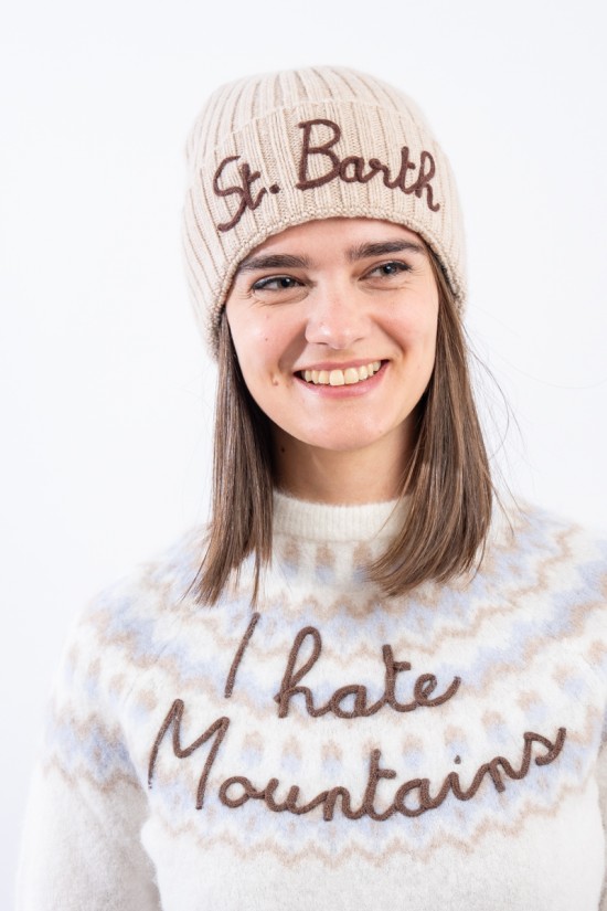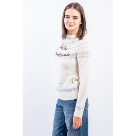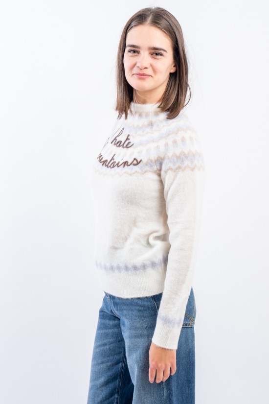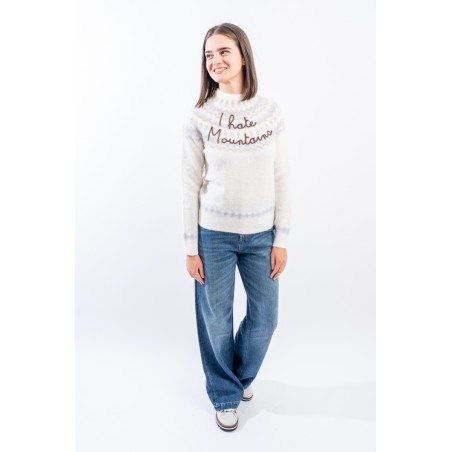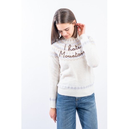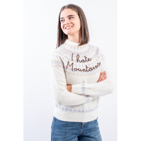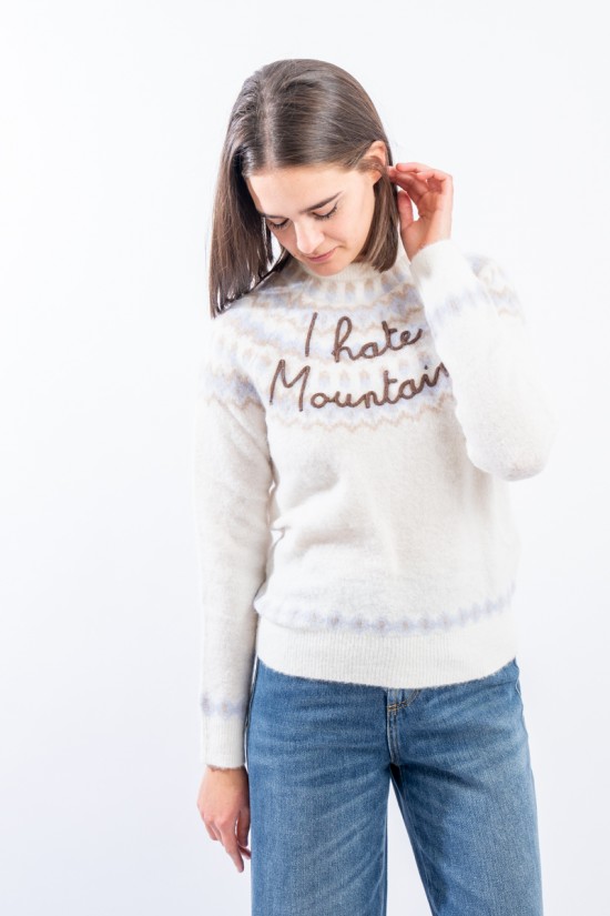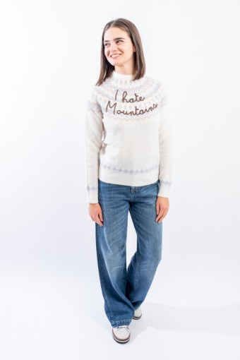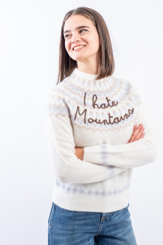 Maglia girocollo realizzata in un morbido filato di alpaca, caldo e confortevole. Caratterizato dal motivo norvegese e dalla scritta embossed "I hate mountains". Girocollo, fondo e polsini a costine. Regular fit.