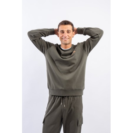 Felpa girocollo leggermente felpata all'interno. Il fondo, lo scollo e i polsini sono lavorati a costine ed elasticizzate. Vestibilità regolare. Confortevole e calda è perfetta coordinata al pantalone della stessa linea.