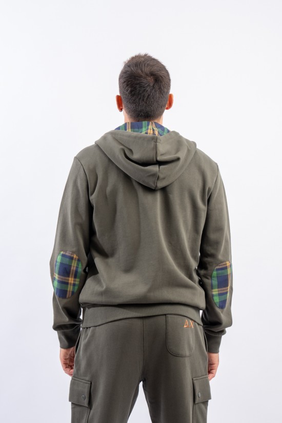 Felpa full zip con cappuccio leggermente felpata all'interno. Il fondo e i polsini sono lavorati a costine strette ed elasticizzate. Il cappuccio è doppiato in tessuto check richiamato sulle toppe dietro il gomito. Vestibilità regolare. Confortevole e calda è perfetta coordinata al pantalone della stessa linea.