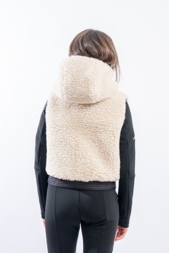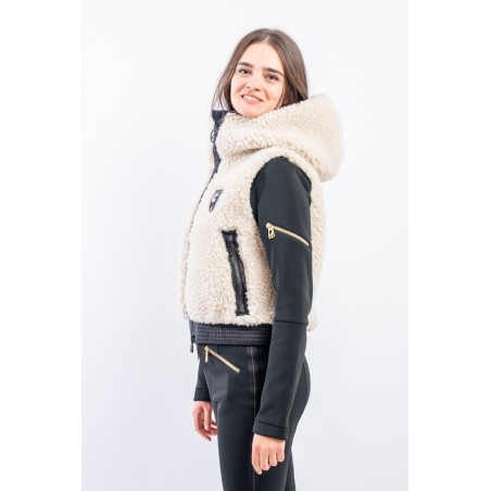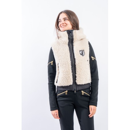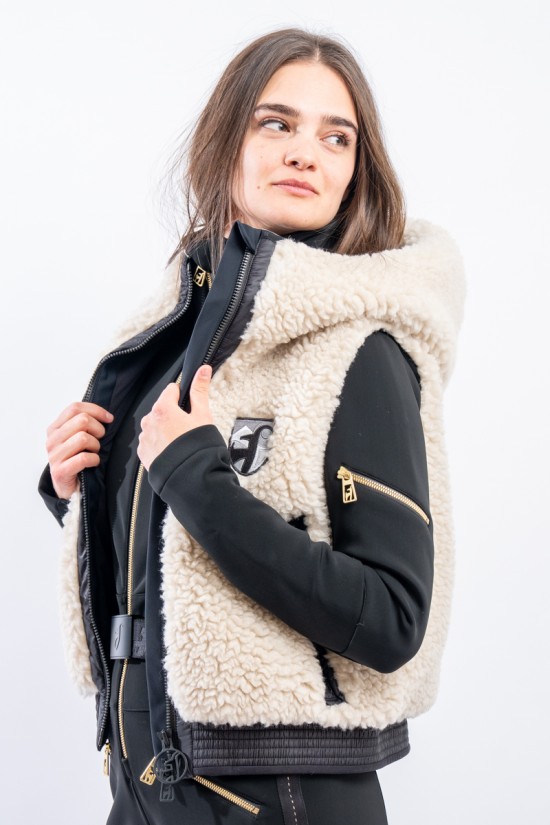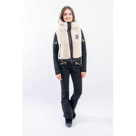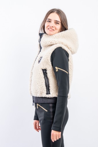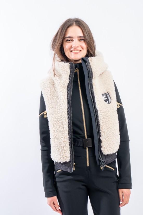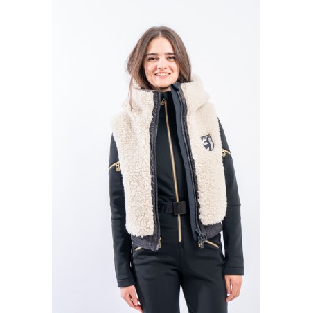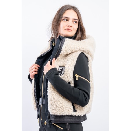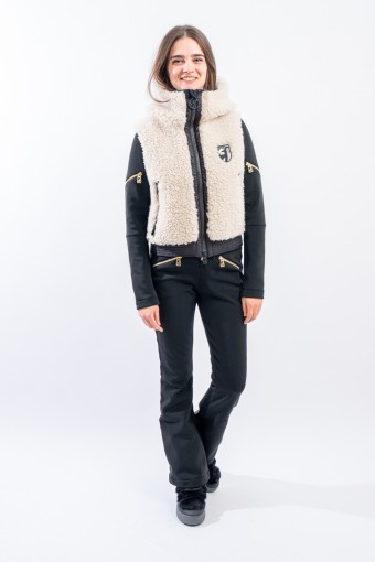 Look contemporaneo e piacevole morbidezza al tatto contraddistinguono Jetti, il gilet firmato Toni Sailer. Realizzato in Softshell e rivestito in misto lana effetto teddy, indossato è confortevole, caldo e dal look prezioso ed originale. L'elasticità del tessuto consente una perfetta vestibilità e la membrana in PU garantisce traspirabilità ed un ottimale protezione agli elementi. Caratterizzato da un ampio cappuccio rifinito con bordatura elastica e dalla fascia al fondo, assicura protezione ed una perfetta aderenza. Due tasche con dettaglio zip YKK® METALUXE® sono pratiche e resistenti. Per arricchire un look più semplice o per un après-ski di stile, Jetti è il capo giusto.