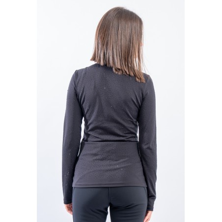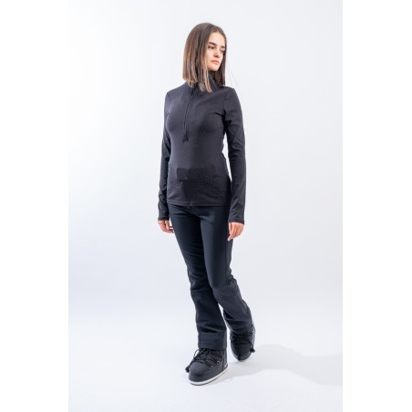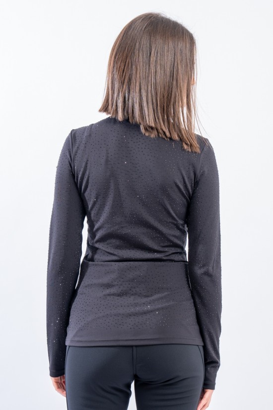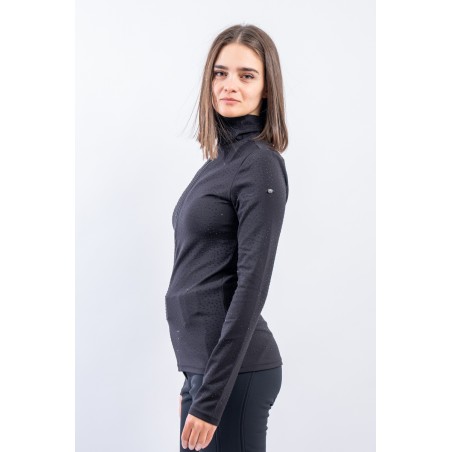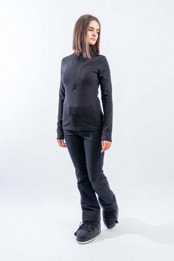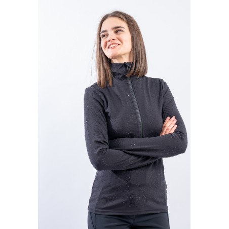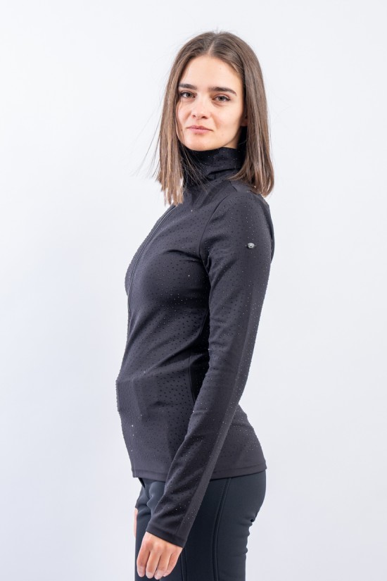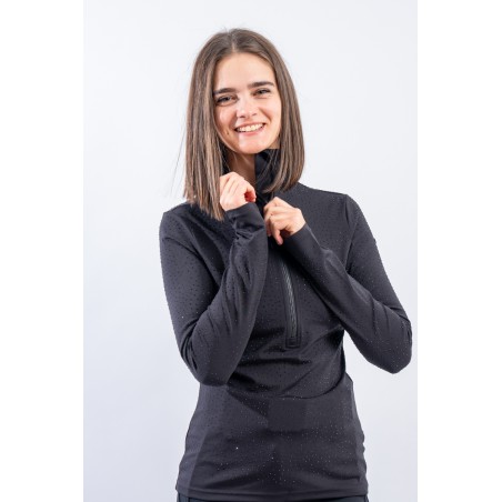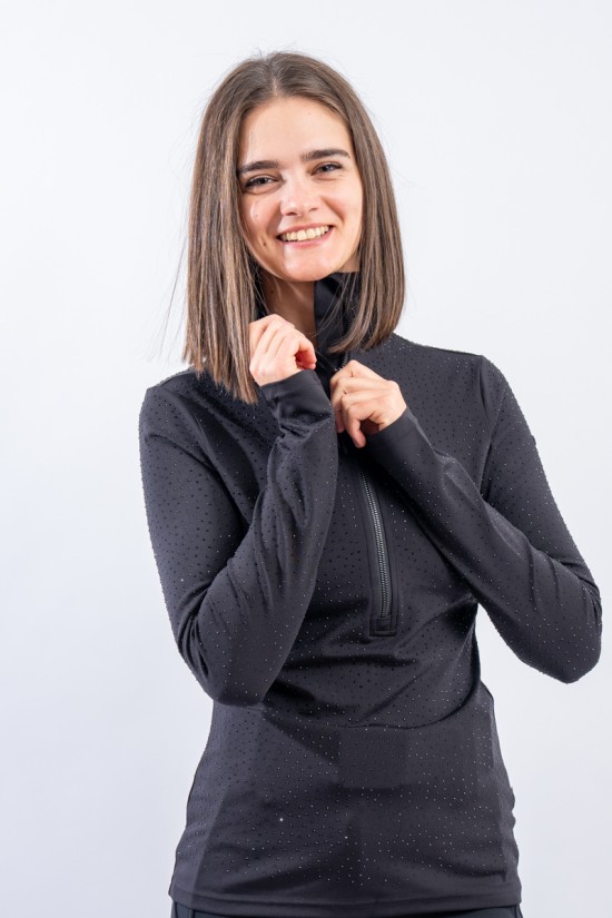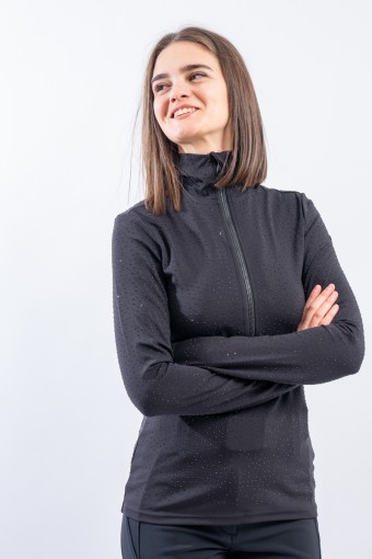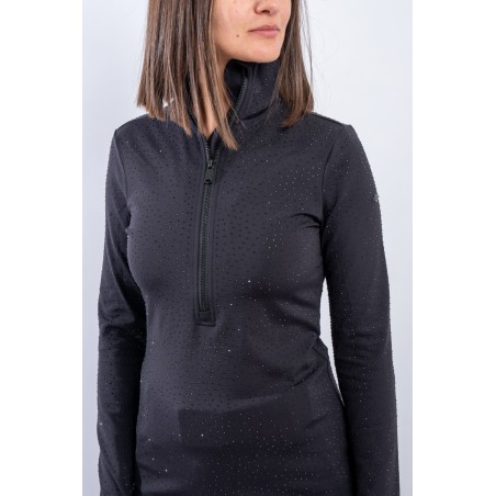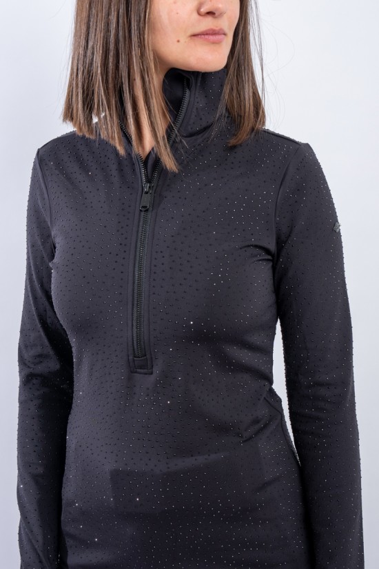 Sottotuta a mezza zip realizzato in tessuto elasticizzato microfelpato con tecnologia SILVADUR, antibatterico ed antiodore. Caratterizzato dall'applicazione di strass tono su tono all over è un capo funzionale e chic. Confortevole, caldo e traspirante è ideale sotto la giacca sci e per praticare ogni attività all'aria aperta.