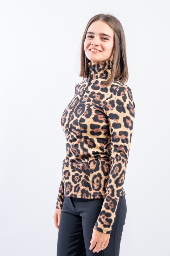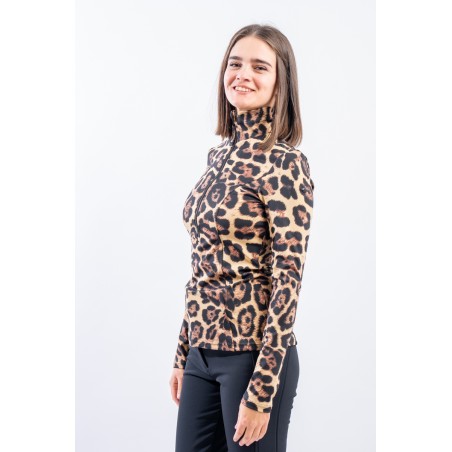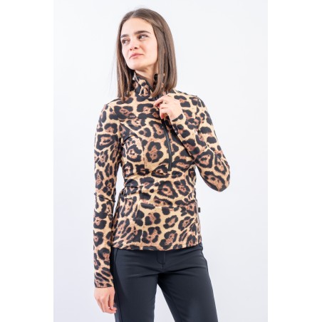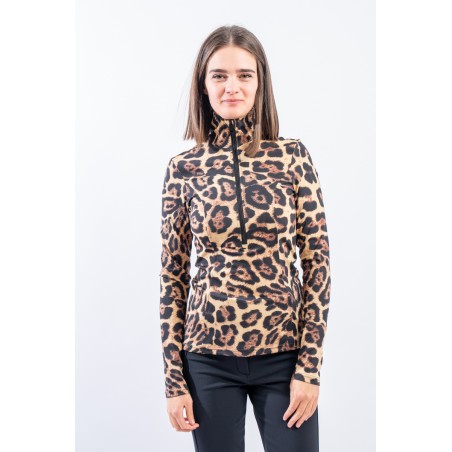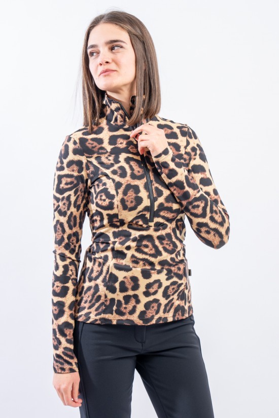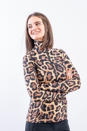 Sottotuta a mezza zip realizzato in tessuto elasticizzato microfelpato con tecnologia SILVADUR, ad azione antibatterica ed antiodore. Caratterizzato dalla stampa animalier e dalla profonda zip metallica. Confortevole, caldo e traspirante è ideale sotto la giacca sci e per praticare ogni attività all'aria aperta.
