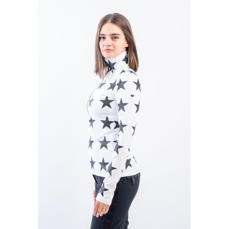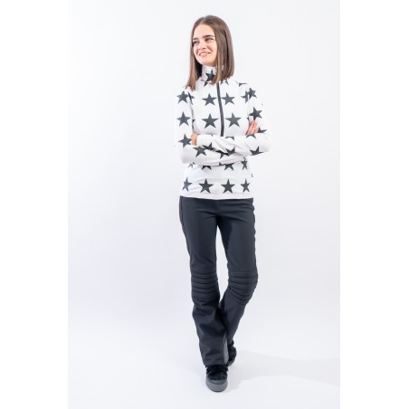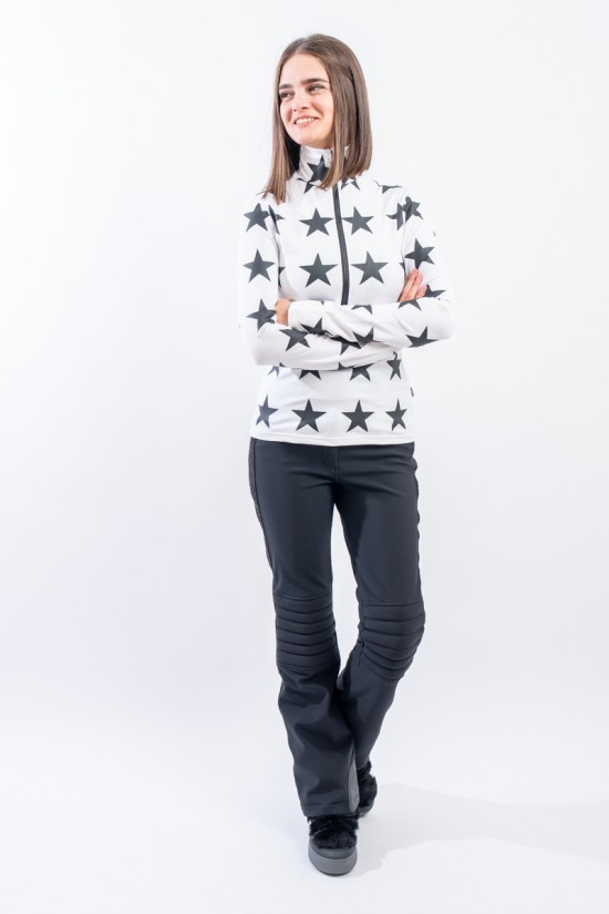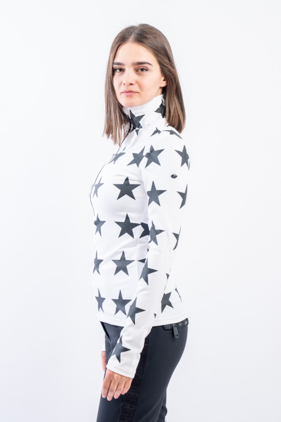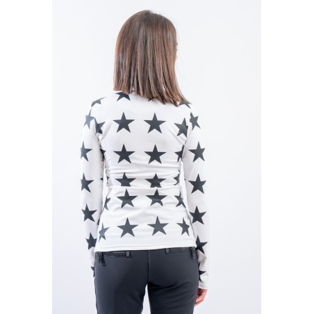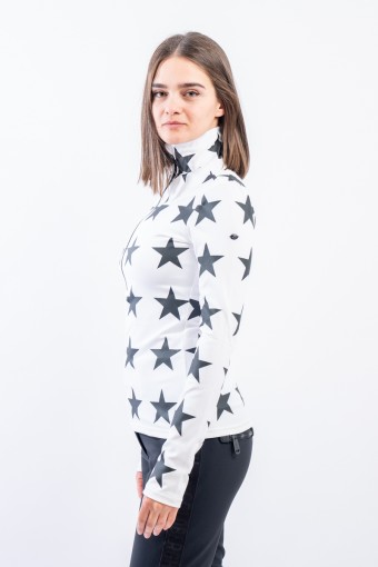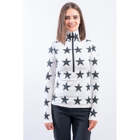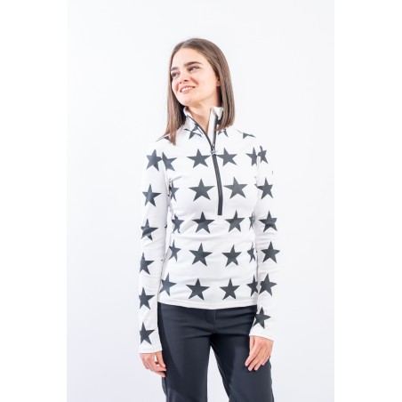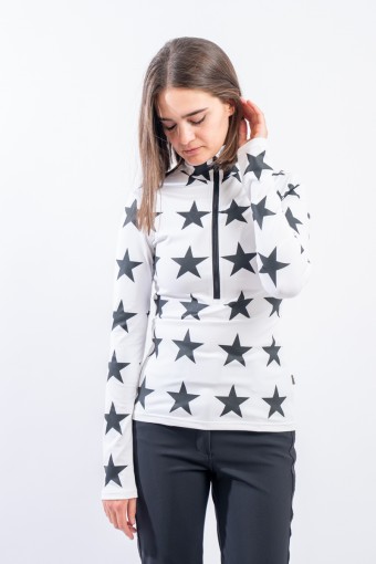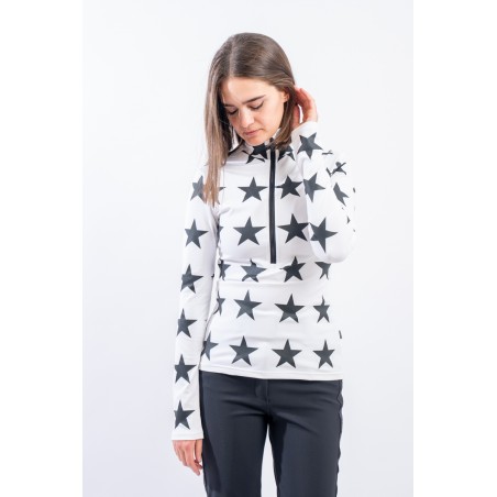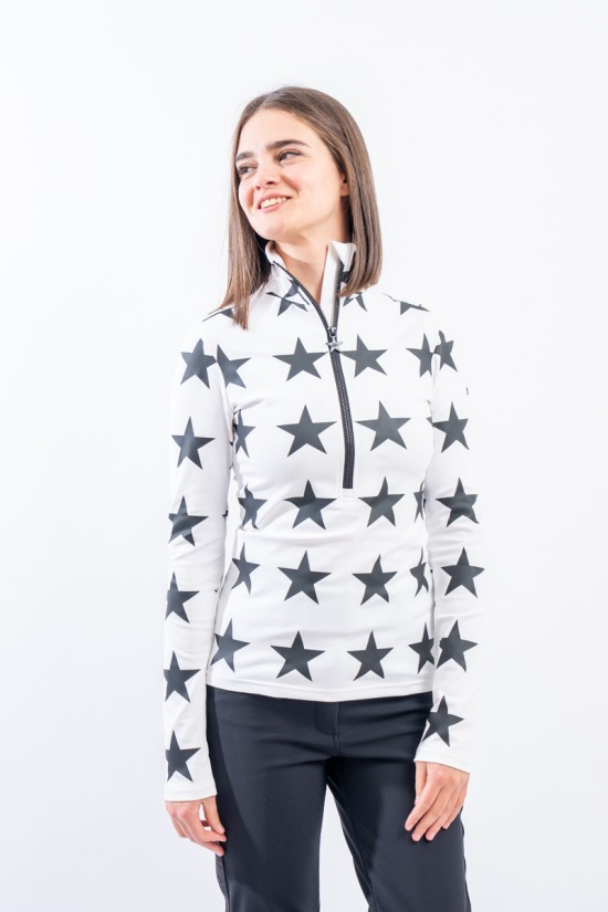 Sottotuta mezza zip realizzato in tessuto elasticizzato microfelpato con tecnologia SILVADUR, ad azione antibatterica e anti odore. Confortevole, caldo e traspirante. Caratterizzato dalla profonda zip e dalla stampa a contrasto con motivo a stella all over. Ideale sotto la giacca sci e per ogni attività all'aria aperta.