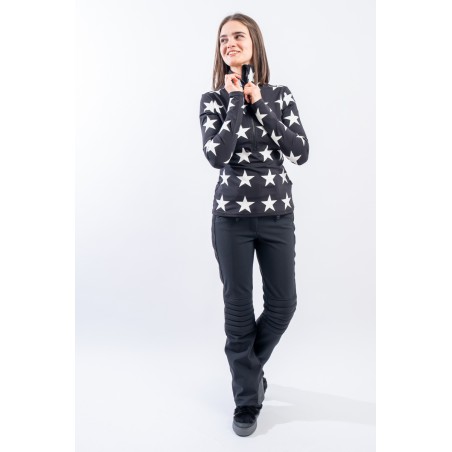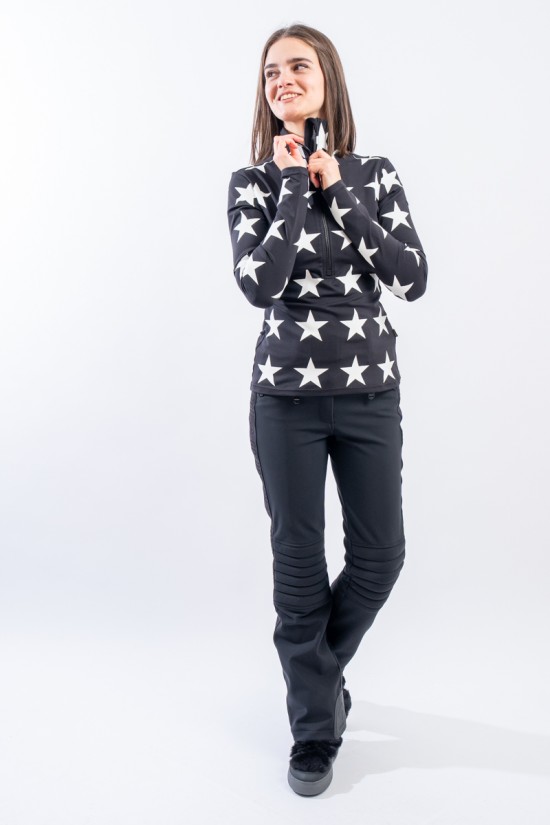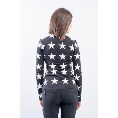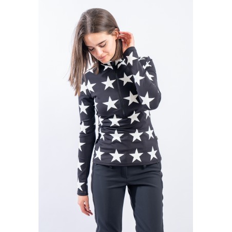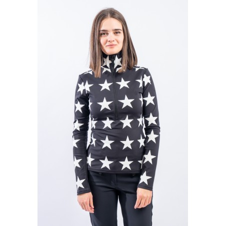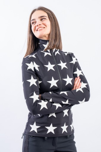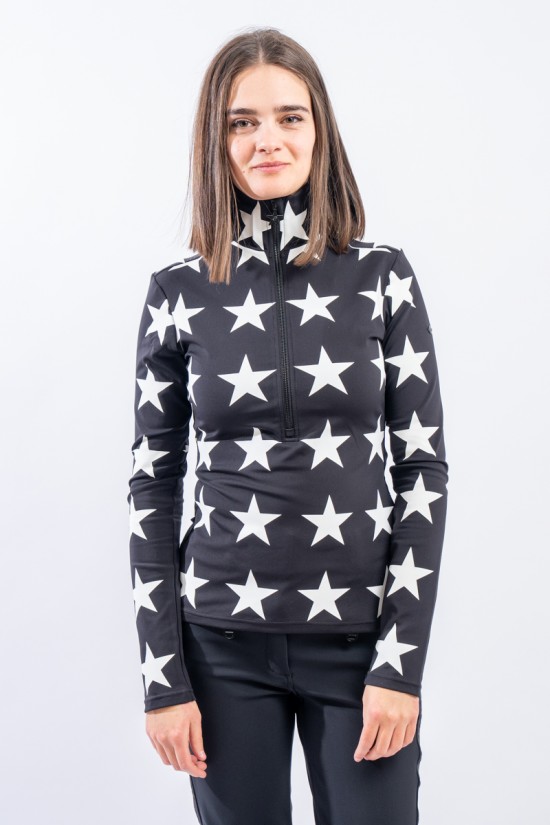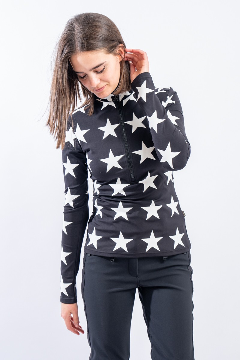 Sottotuta mezza zip realizzato in tessuto elasticizzato microfelpato con tecnologia SILVADUR, ad azione antibatterica e anti odore. Confortevole, caldo e traspirante. Caratterizzato dalla profonda zip e dalla stampa a contrasto con motivo a stella all over. Ideale sotto la giacca sci e per ogni attività all'aria aperta.