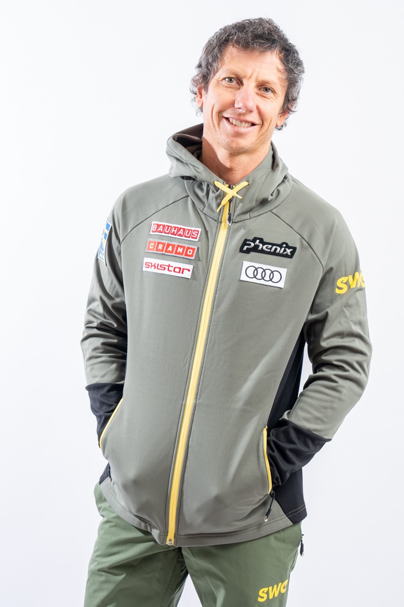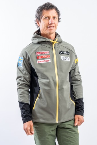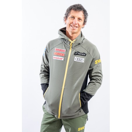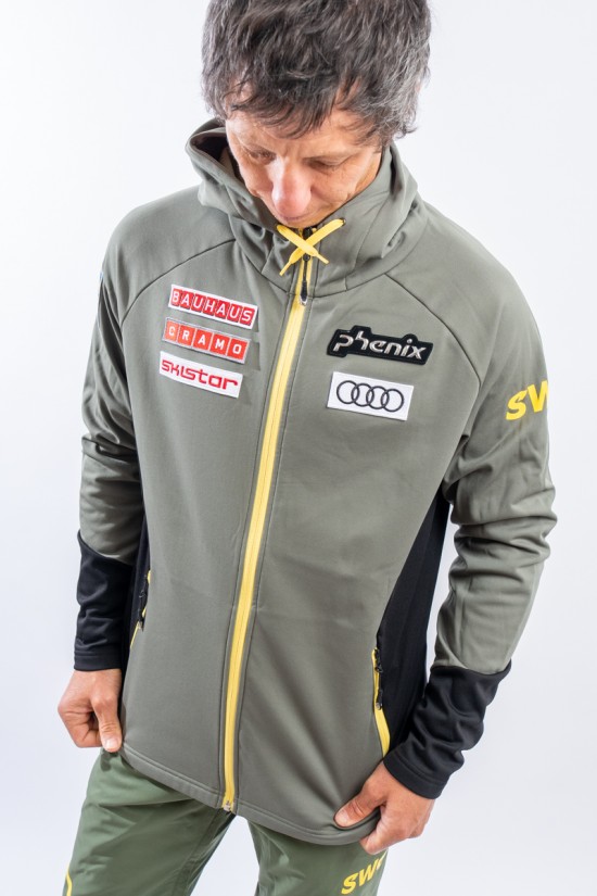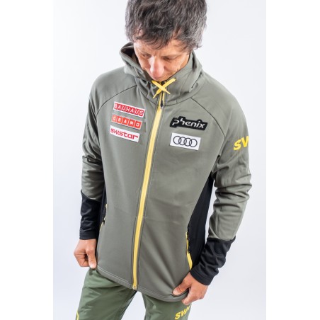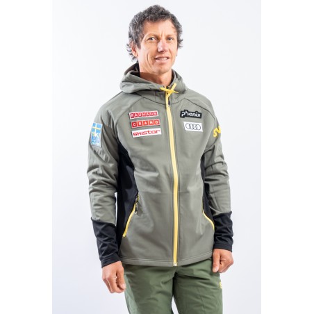 Sottotuta full zip realizzato in tessuto tecnico elasticizzato felpato e traspirante. Il collo alto ed il cappuccio consentono di proteggersi al meglio in caso di necessità durante lo svolgimento di attività all'aperto. Completo di due tasche laterali chiuse con zip è pratico e funzionale. I dettagli a contrasto di colore regalano movimento e dinamicità al design, arricchito dai patch degli sponsor e della squadra svedere.