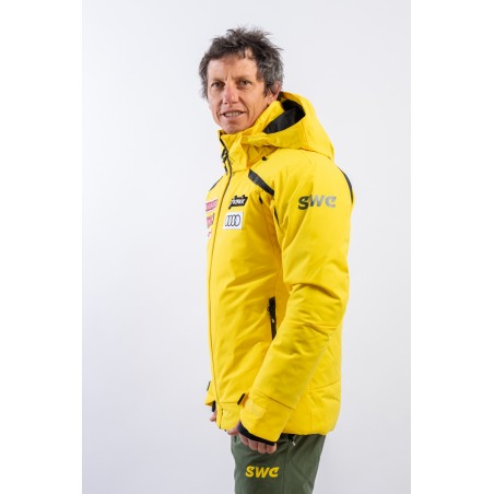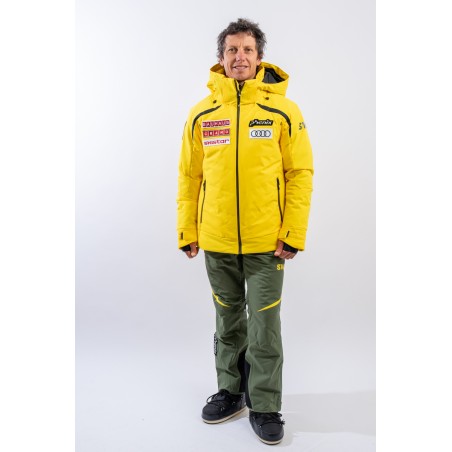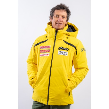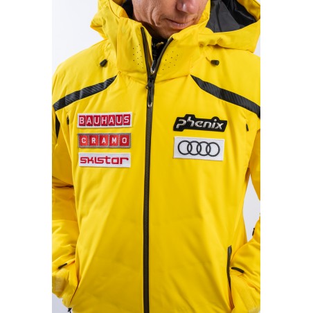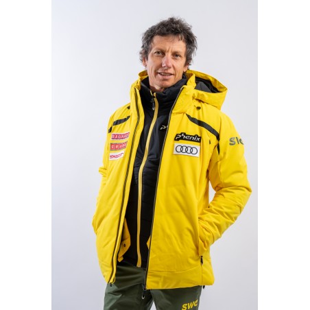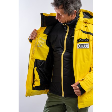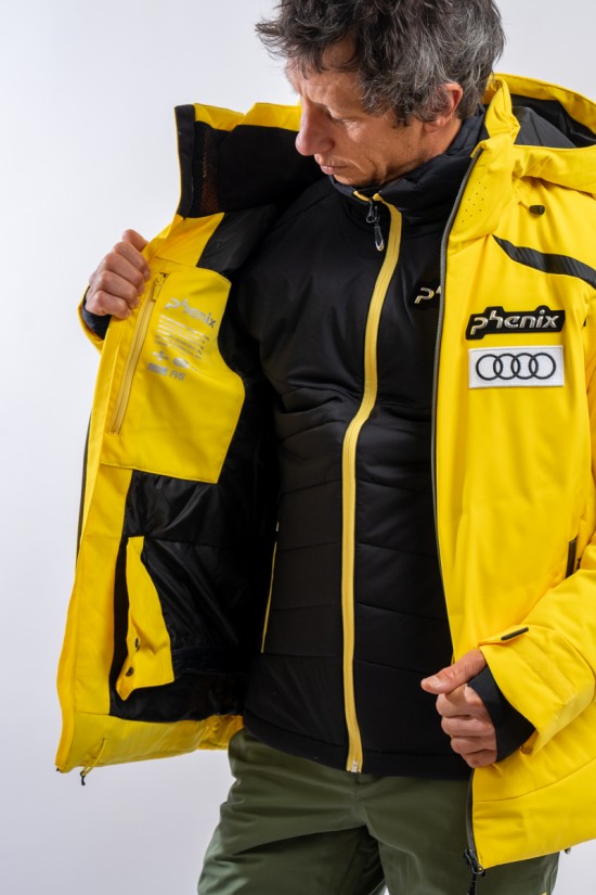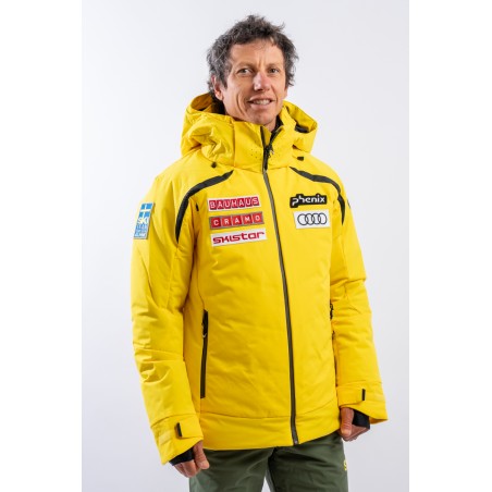 Tecnicità e comfort sono le parole chiave che descrivono la giacca realizzata da Phenix per la squadra svedese di sci alpino. Pensata per rispondere ad elevati standard di prestazione, è realizzata in tessuto tecnico elasticizzato in 4 direzioni, altamente impermeabile e traspirante. Imbottita in un mix di piuma e Phenix Hallow Thermo, cattura e rilascia il calore prodotto dal corpo, assicurando isolazione e calore ottimali. Design semplice arricchito da ogni optional anti neve. Le zip di ventilazione supplementare, e il cappuccio staccabile, consentono di regolare il micro clima interno e di adattare la giacca a seconda della necessità. Il modello riporta i patch degli sponsor ufficiali sul petto per un look sportivo professionistico.
