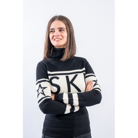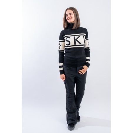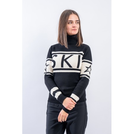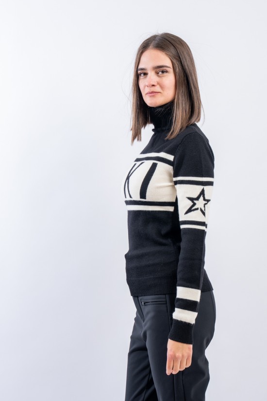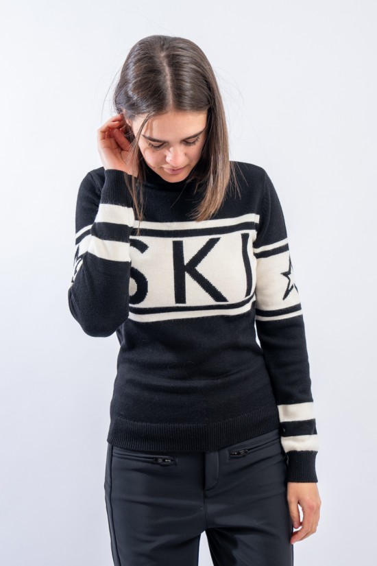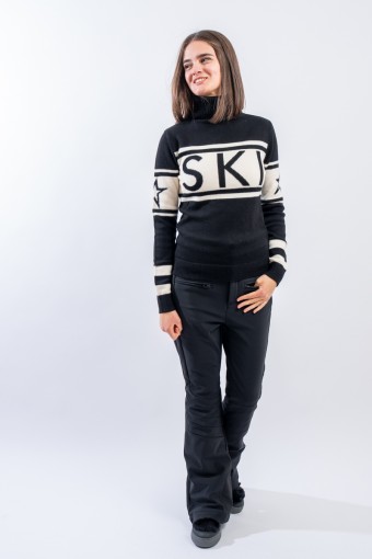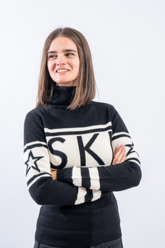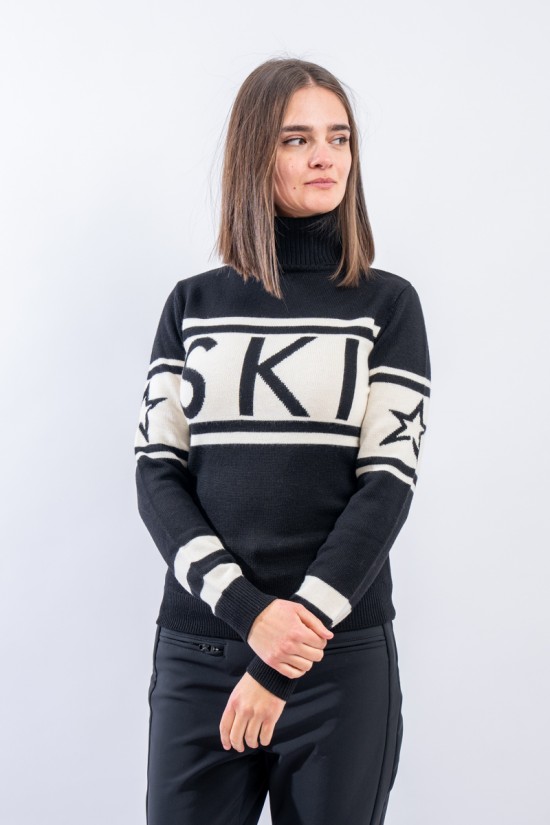 Dolcevita realizzato in lana merinos 100%. Morbida, calda e piacevole indosso. Il collo alto avvolgente, protegge e dona una maggior sensazione di calore. La vestibilità regular la rende confortevole. Il design semplice è arricchito dalle finiture a costine sui bordi e dai dettagli a contrasto e dalla scritta sul petto SKI.