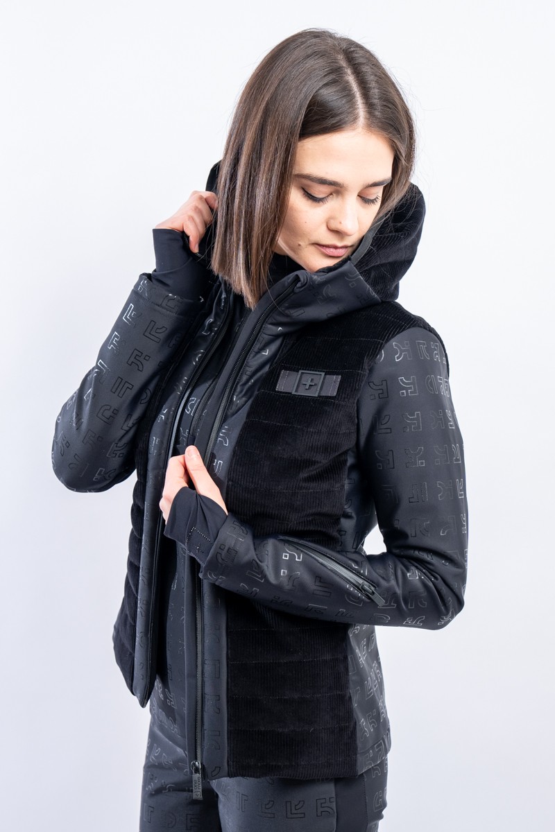 Nata in Alto Adige One More è il risultato della fusione tra sport e natura, si contraddistingue come brand contemporaneo, tecnologico ed ecologico. Il softshell 451 è la giacca dal taglio sportivo contraddistinto da una sofisticata eleganza valorizzata dal taglio sciancrato. Il velluto millerighe effetto 3D sul busto si alterna al tessuto Econylon® su fianchi e maniche, arricchito dall'iconica stampa One More effetto shiny. Adatta ad ogni attività all'aperto quando le temperature sono più alte, o come complemento aggiuntivo nelle giornate più rigide, è dotata di cappuccio e tasca porta skipass. Impreziosito dalla scritta OneMore realizzata in cristalli Swarosvki, è un capo funzionale e pratico che non rinuncia a stile ed eleganza.